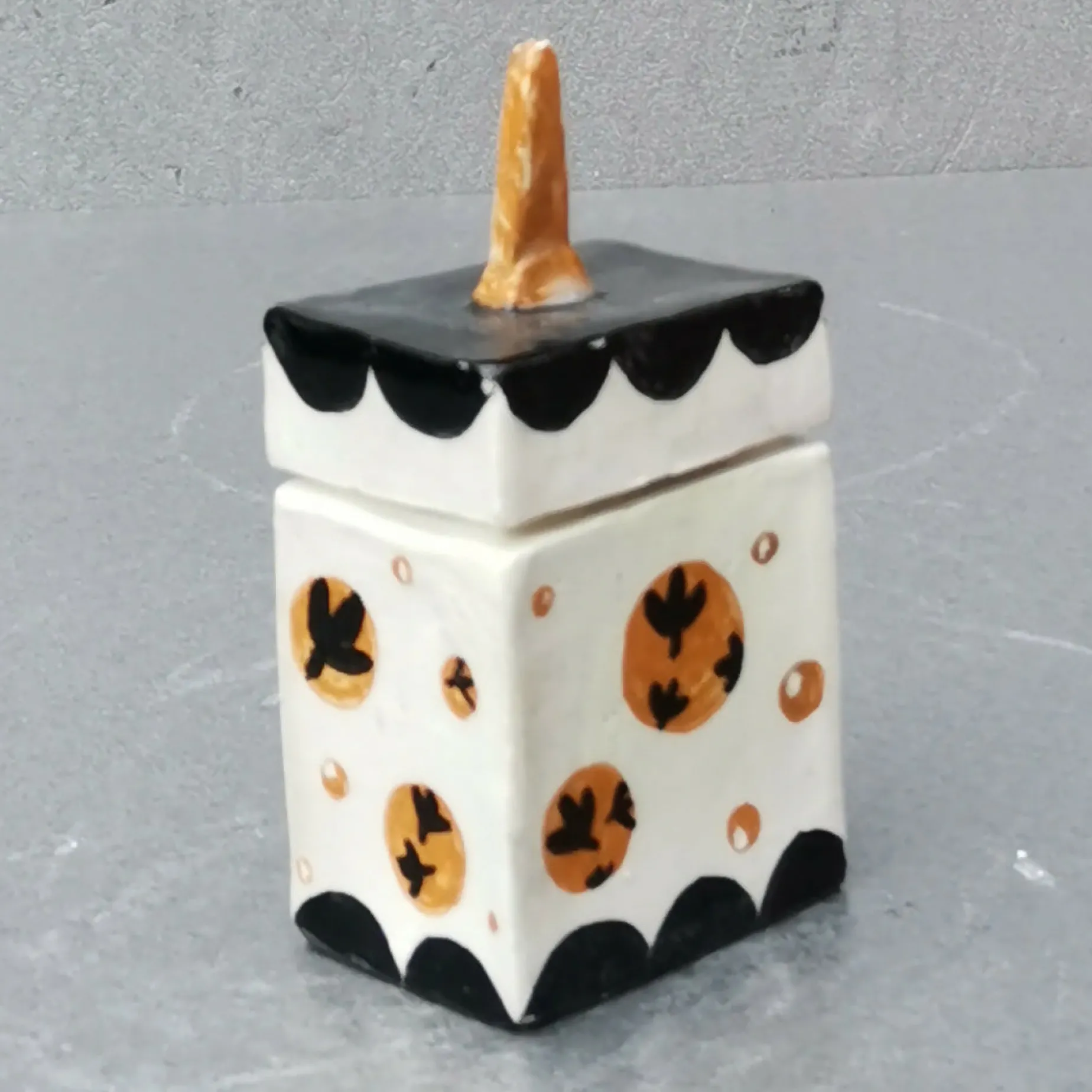 Stoneware pot with hand-painted design by Kathleen Hepworth