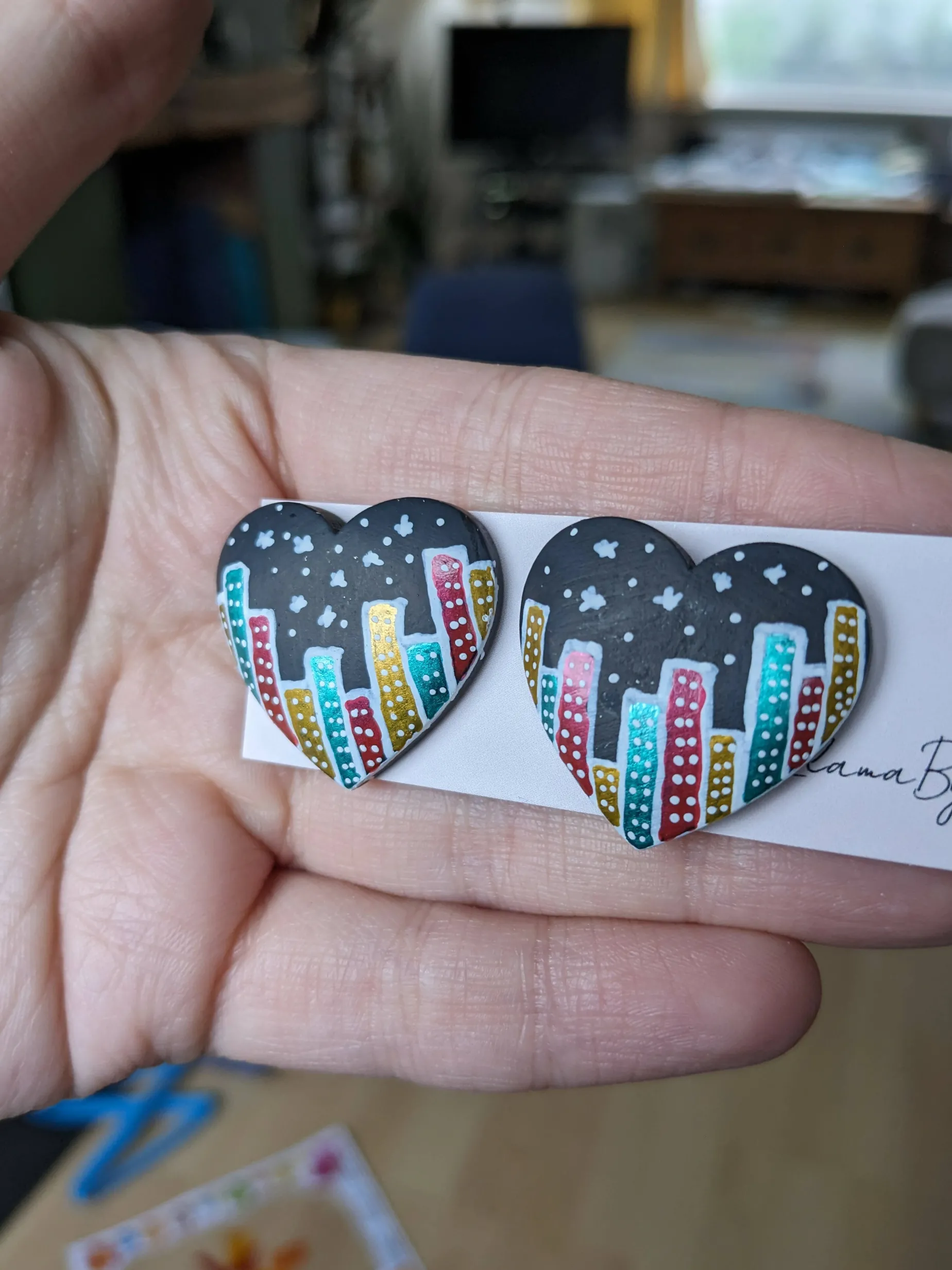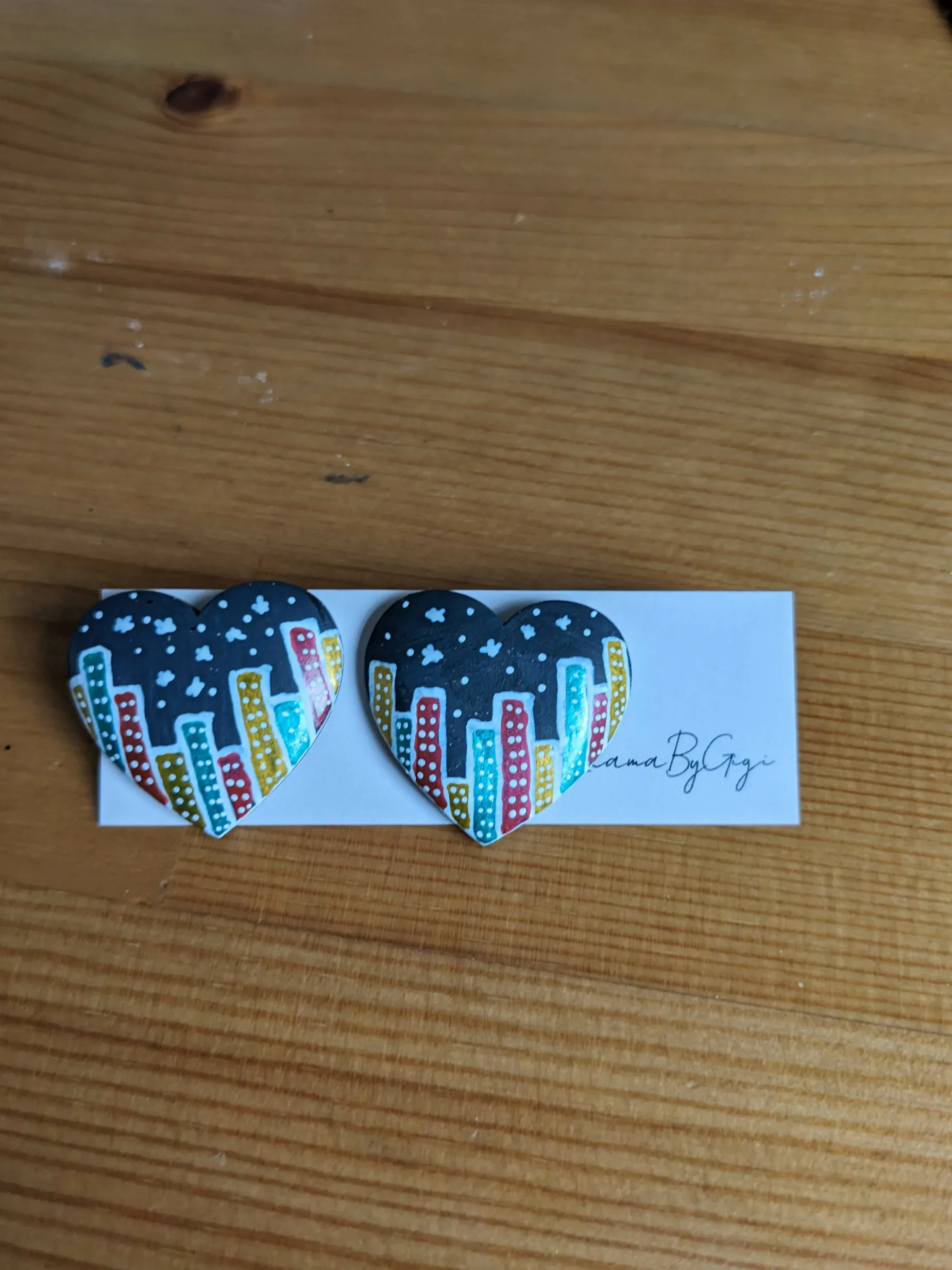 Hand painted with acrylic paint heart shape wooden studs. Have stainless steel studs. City in the snow at night.