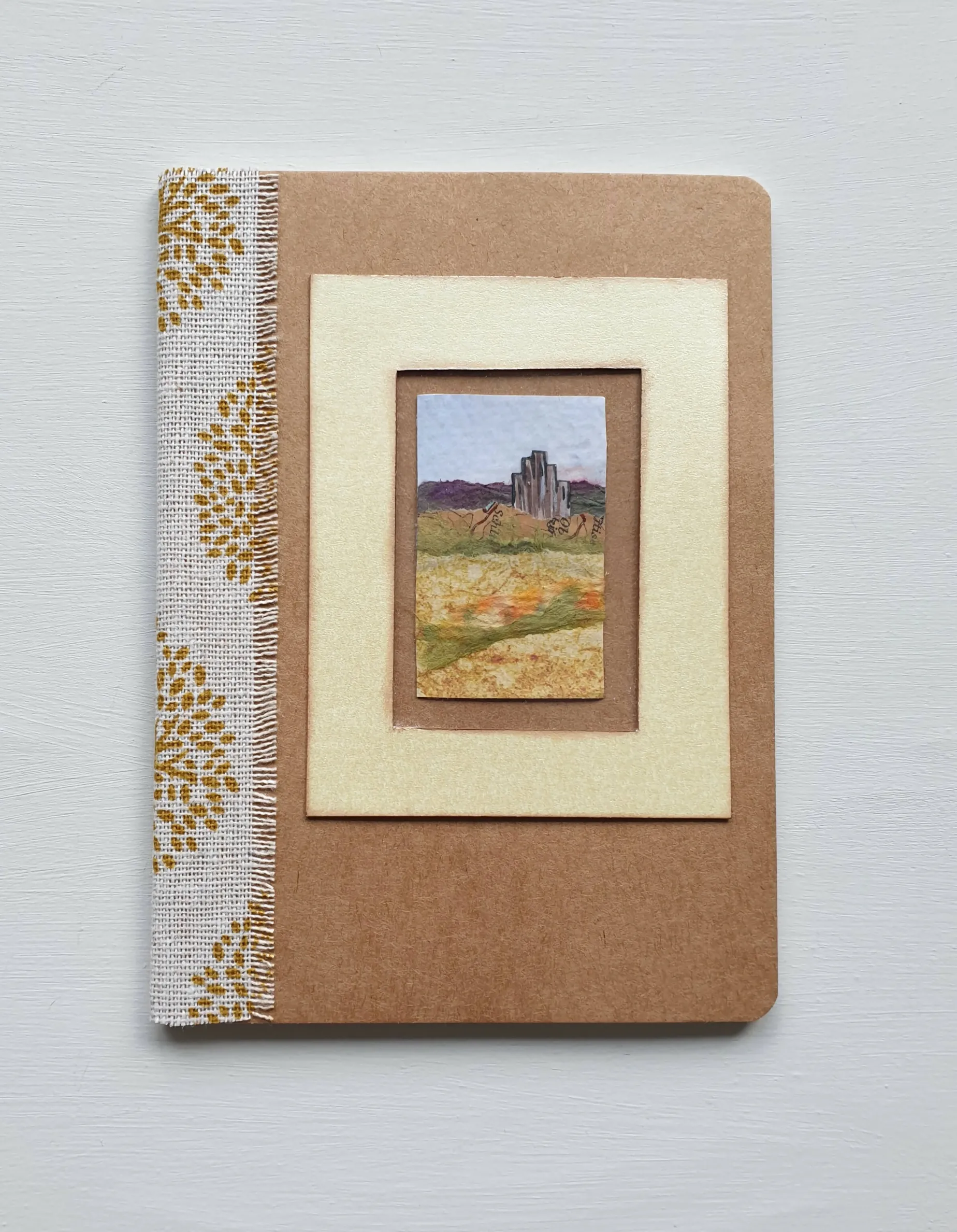 The cover is decorated with an image produced on mixed media paper using acrylic paint and handmade papers and fibres. The image is framed with card and the book spine is decorated with ribbon.