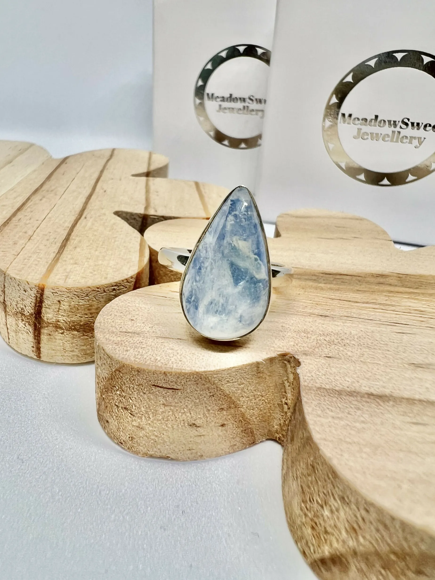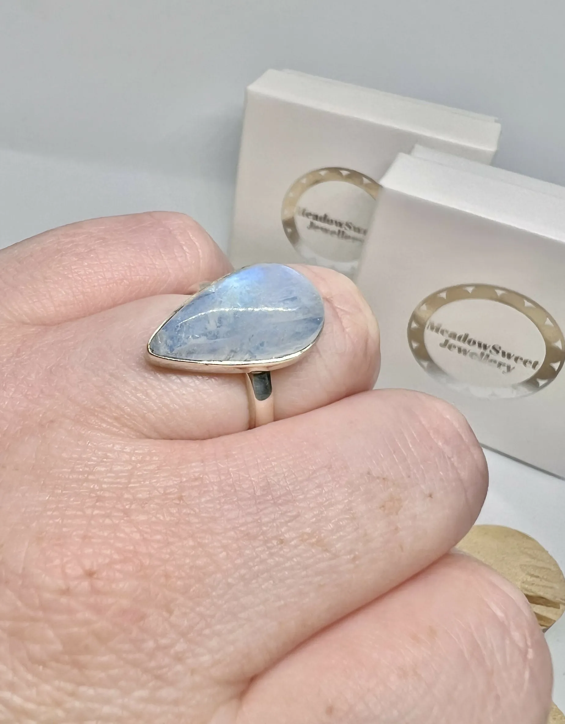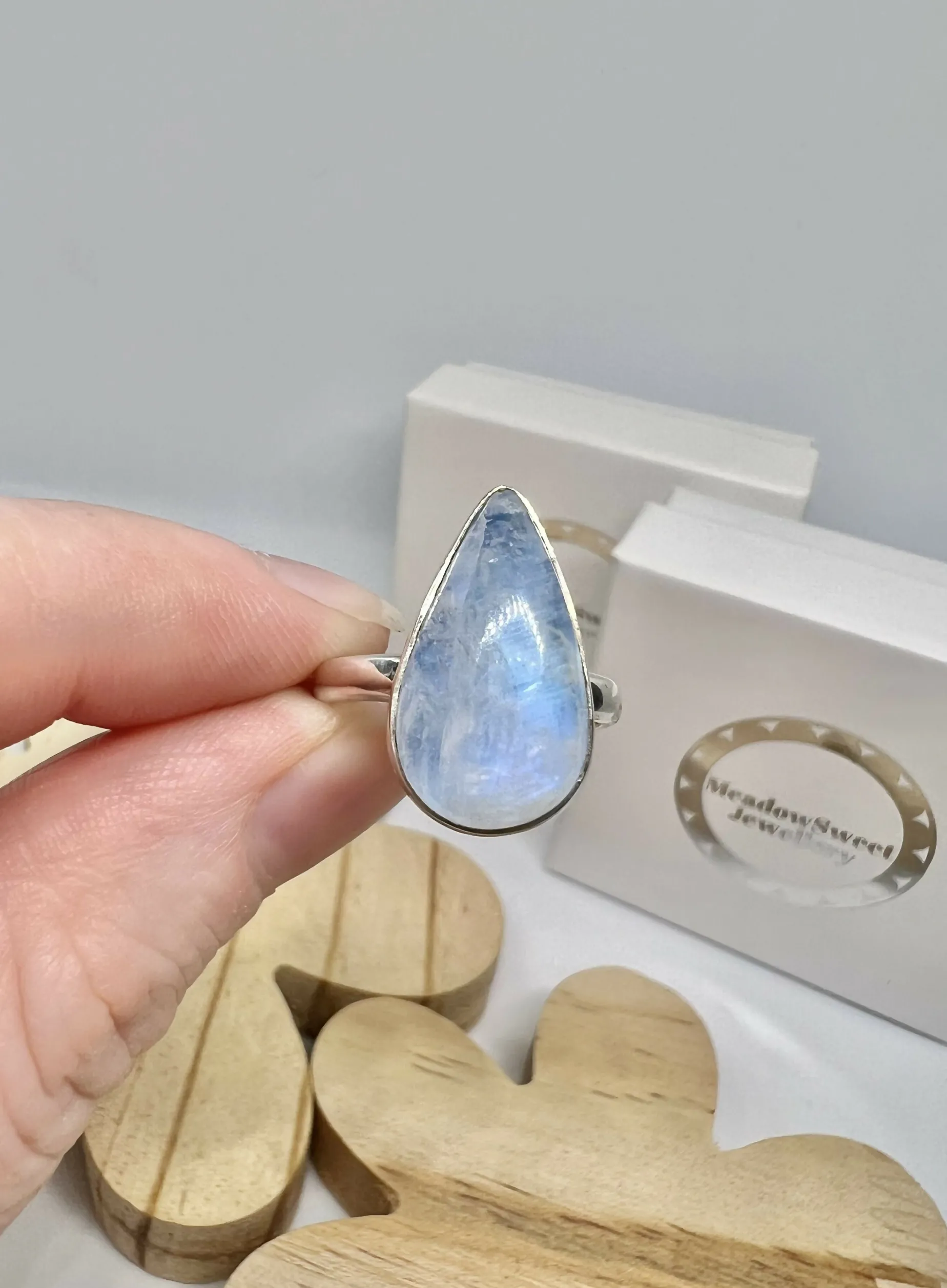 Blue moonstone teardrop shaped ring set in sterling silver size N 1/2