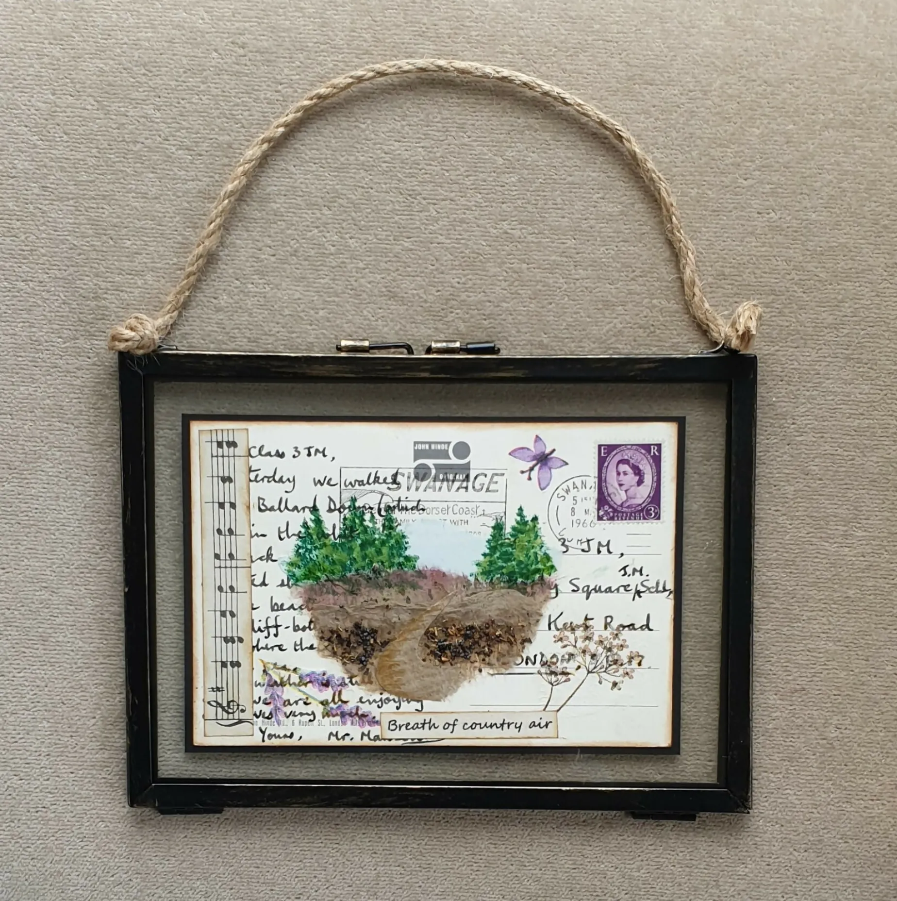 This is a mixed media original produced on a vintage postcard using card, paint and handmade papers.
