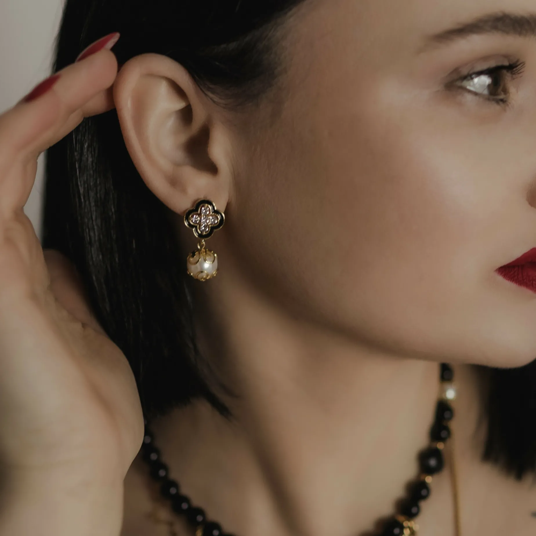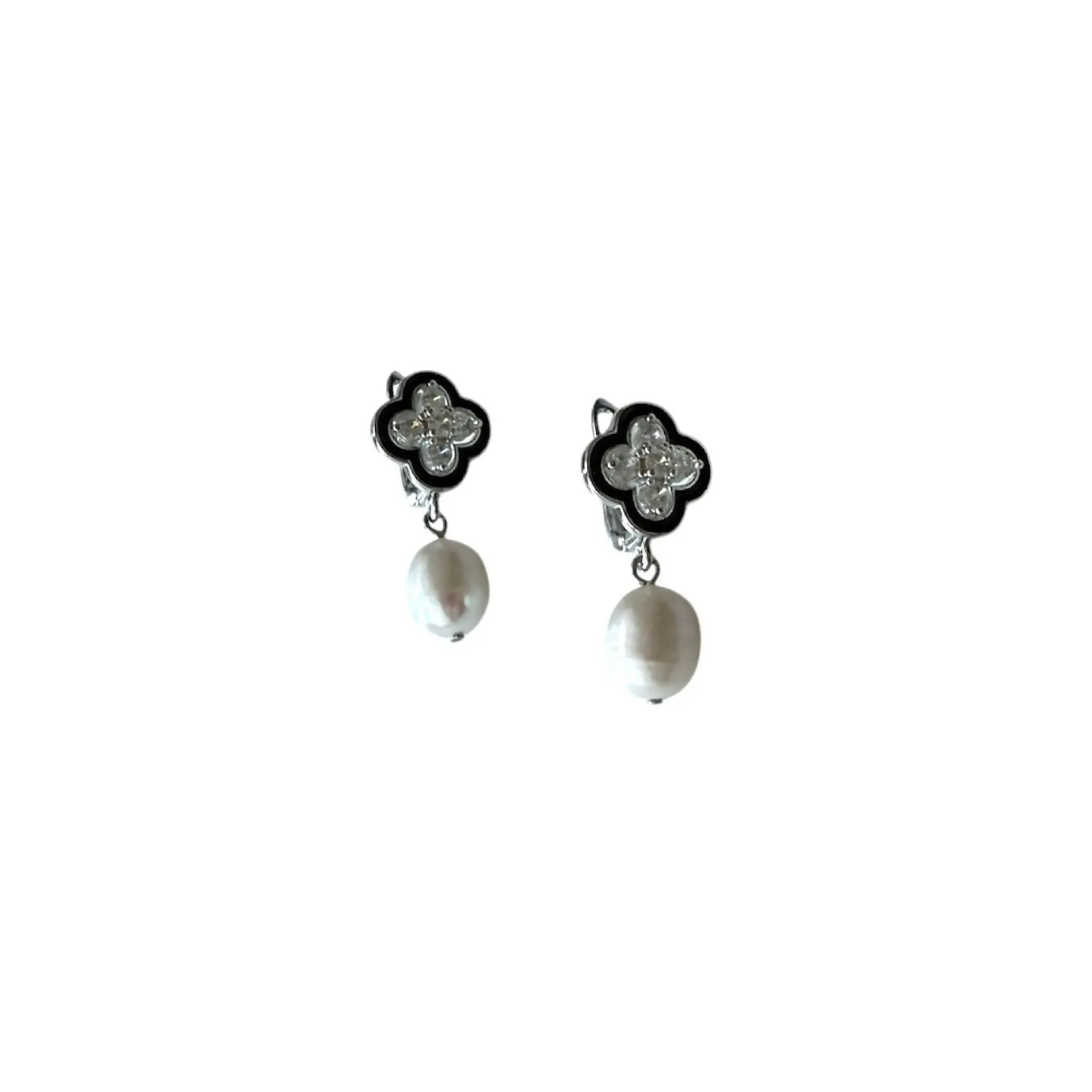 The Clover Earrings blend modern elegance with timeless beauty, featuring a delicate clover flower design adorned with black enamel and finished with luxurious 18K gold rhodium. The perfect balance of bold and refined, these earrings are complemented by natural freshwater pearls that add a soft, iridescent touch, making them a standout piece for any occasion.