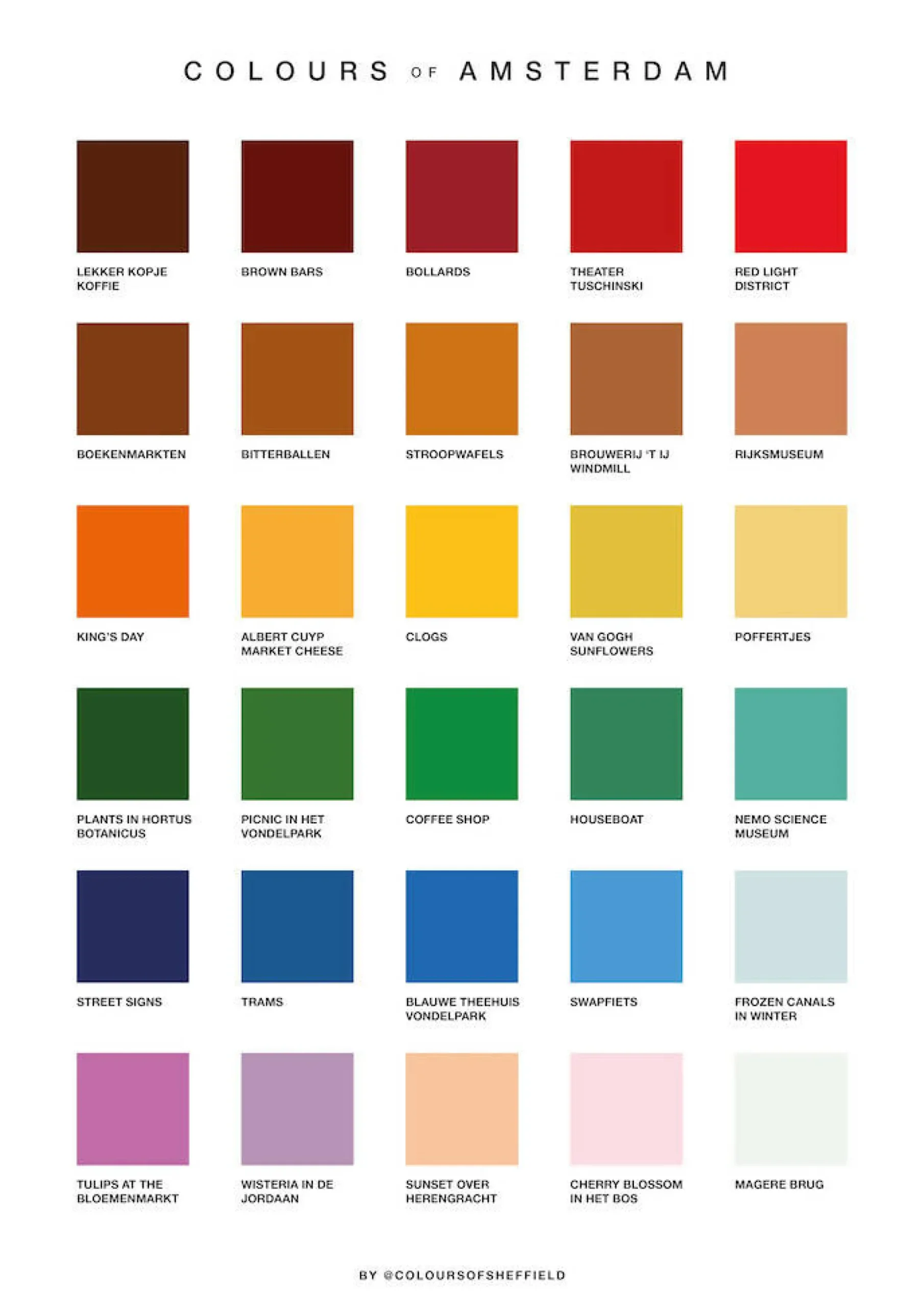 A fun and colourful print depicting a few of the beautiful colours in Amsterdam, The Netherlands!