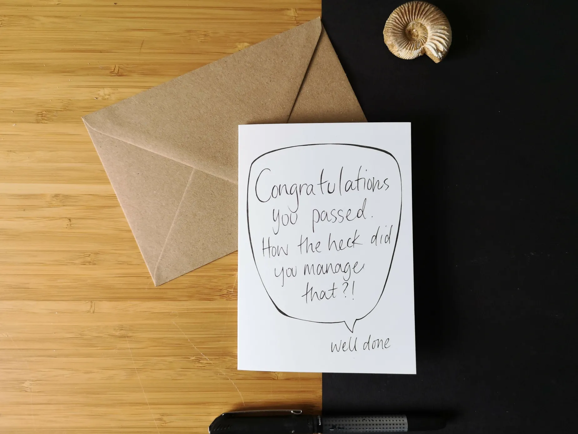 “Congratulations you passed, how the heck did you manage that?” A funny saying on the front of the card if you like a little slap stick.