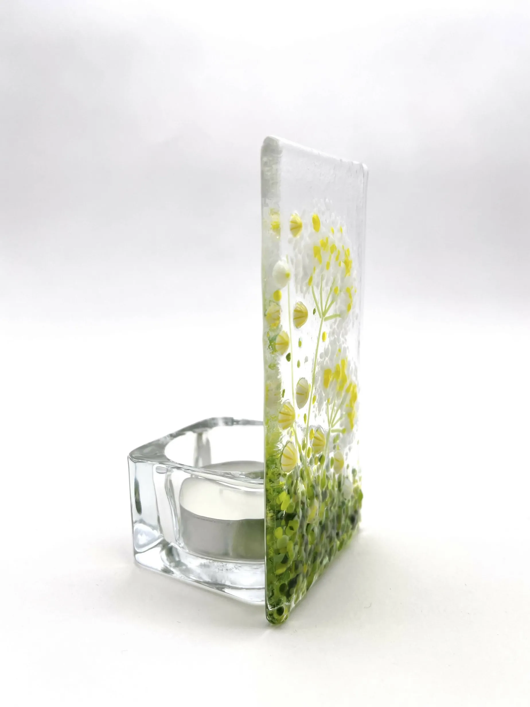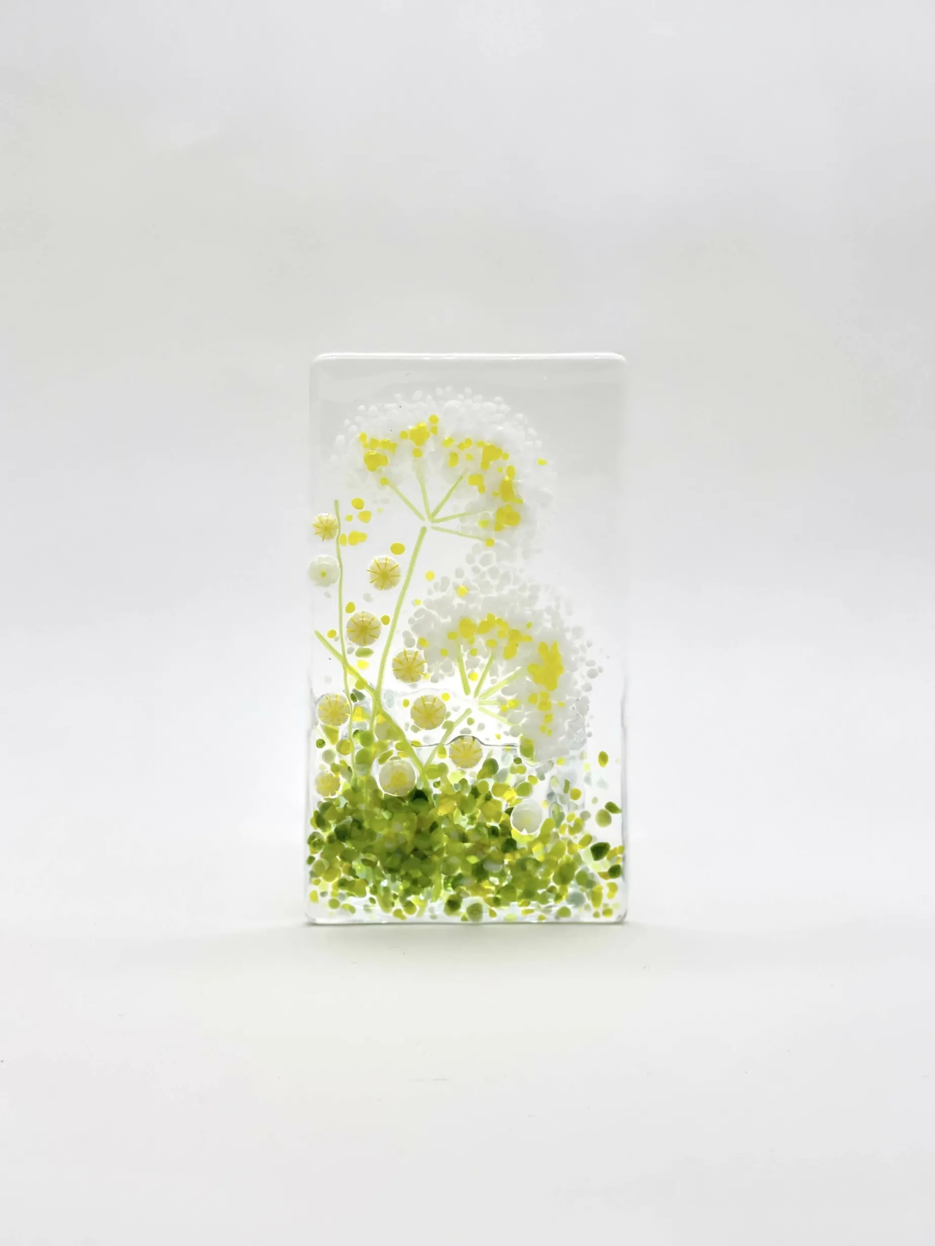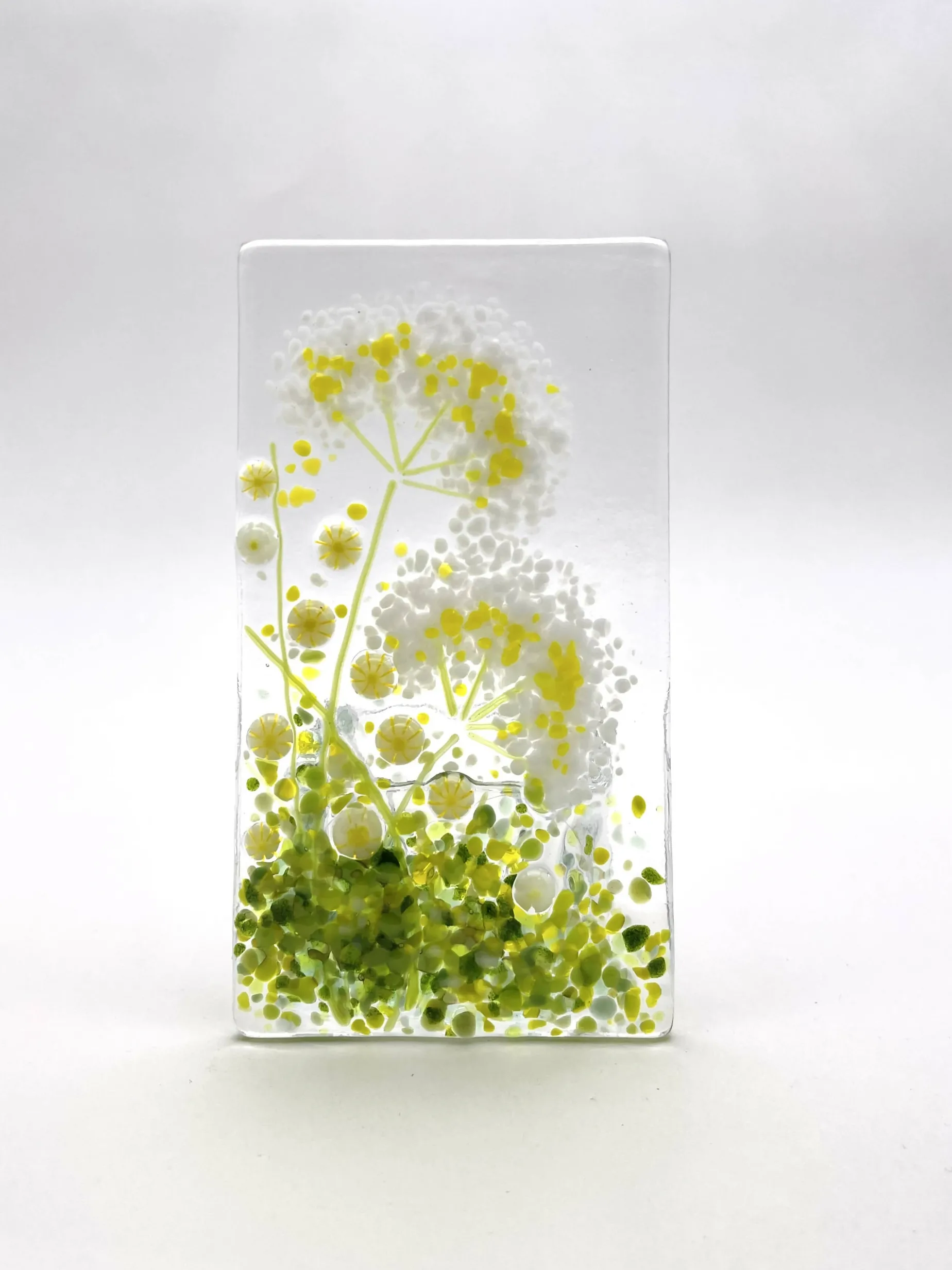This is a very pretty floral design clear glass plaque featuring beautiful white dill flowers with a touch of lemon yellow.