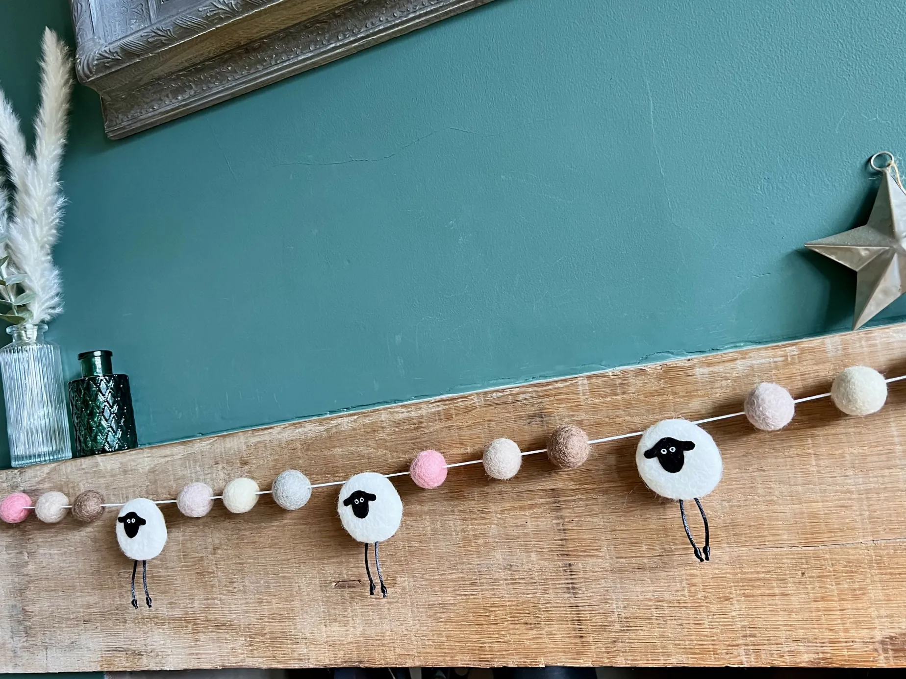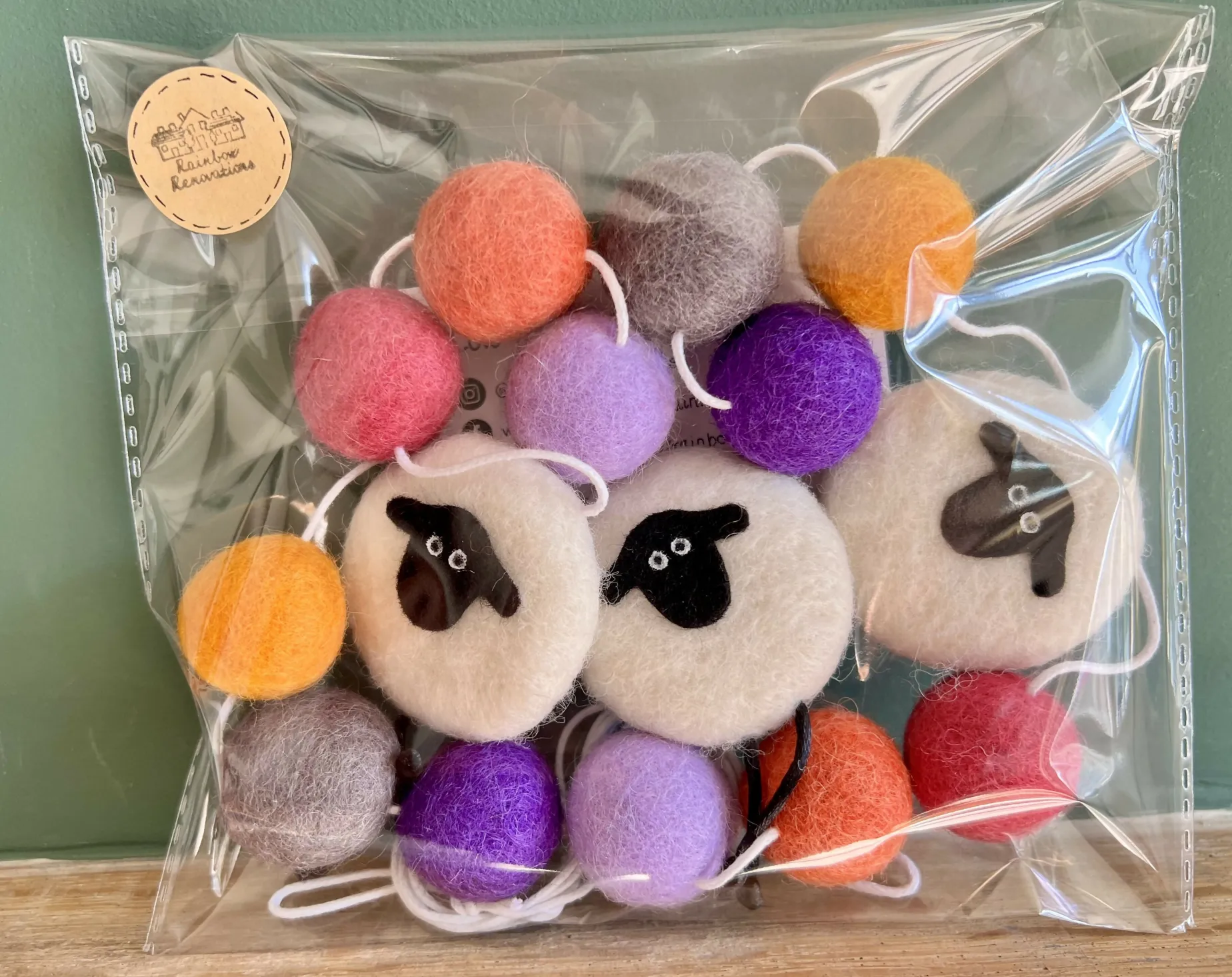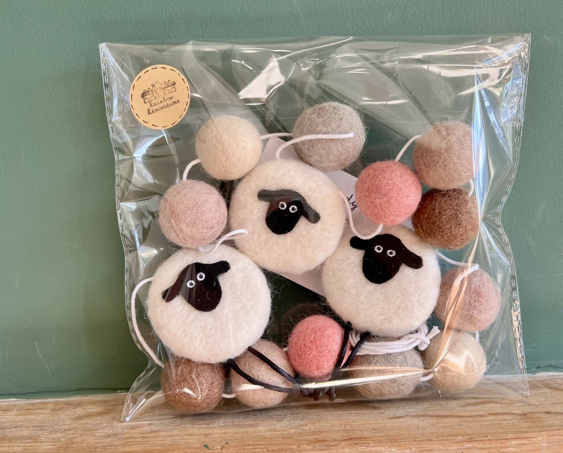 The garland consists of 3 needle felted sheep all needle felted by hand from Quality Corriedale and 12 felt balls made from New Zealand wool.
