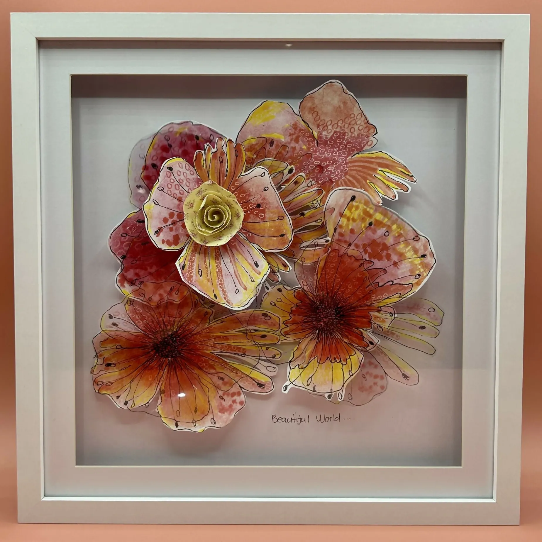 32x32cm White frame with mixed media flowers, perfect to brighten any wall, shelf or surface!