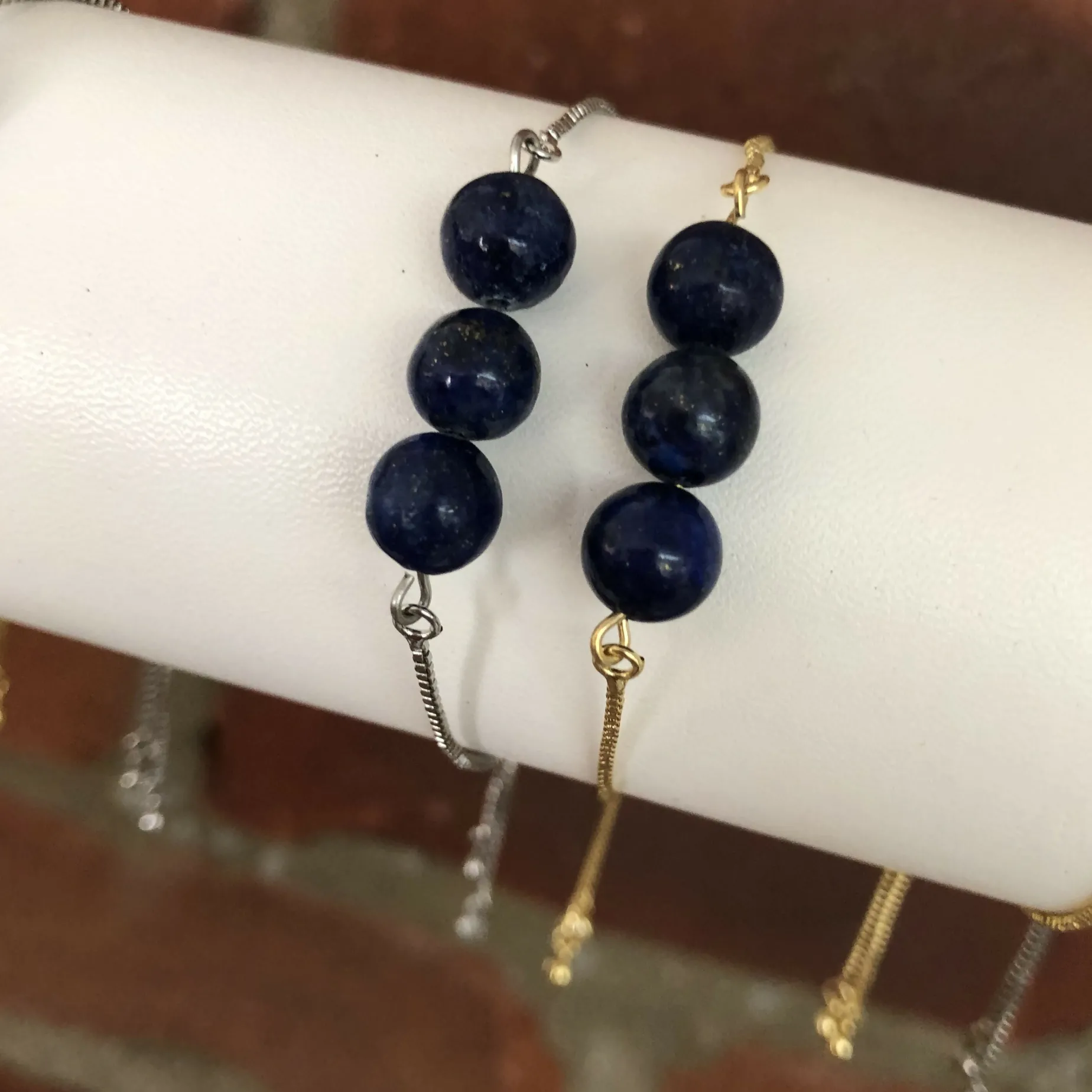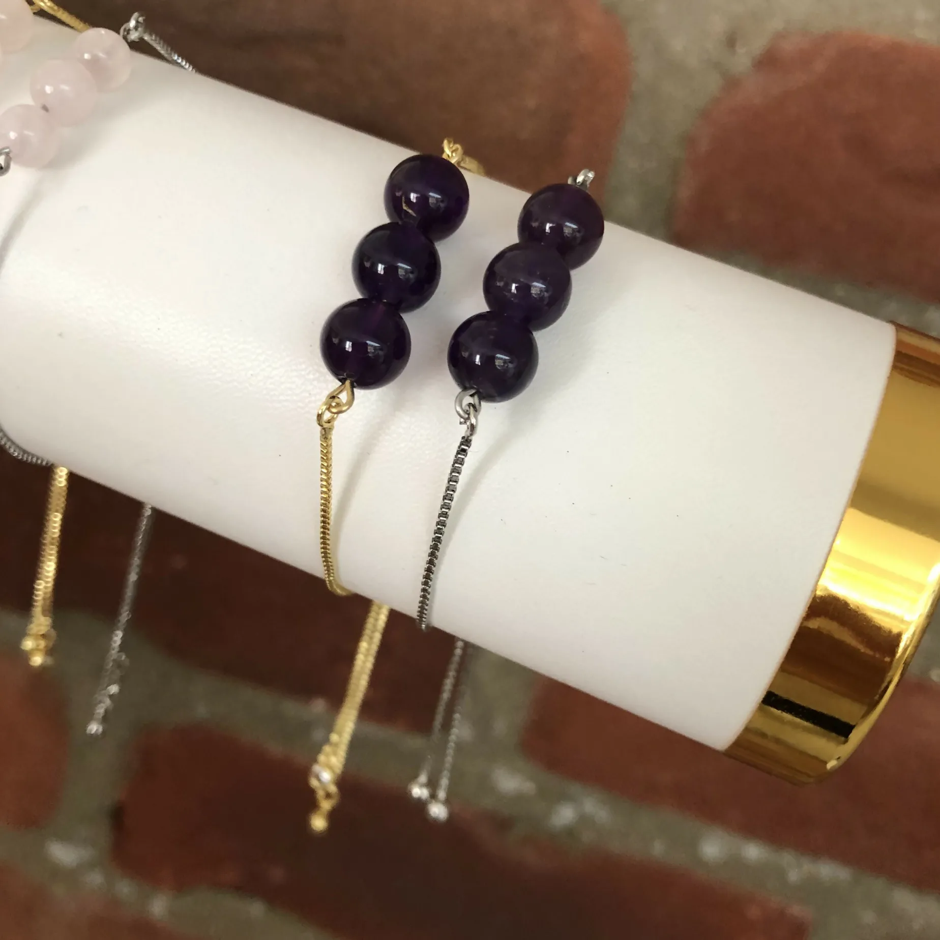 Hand crafted genuine gem stone bracelets available in Amethyst, Rose Quartz, Lapis Lazuli, Tigers Eye and Dalmatian Jasper. Known for their healing properties, wear on your left hand to receive or right hand to give.