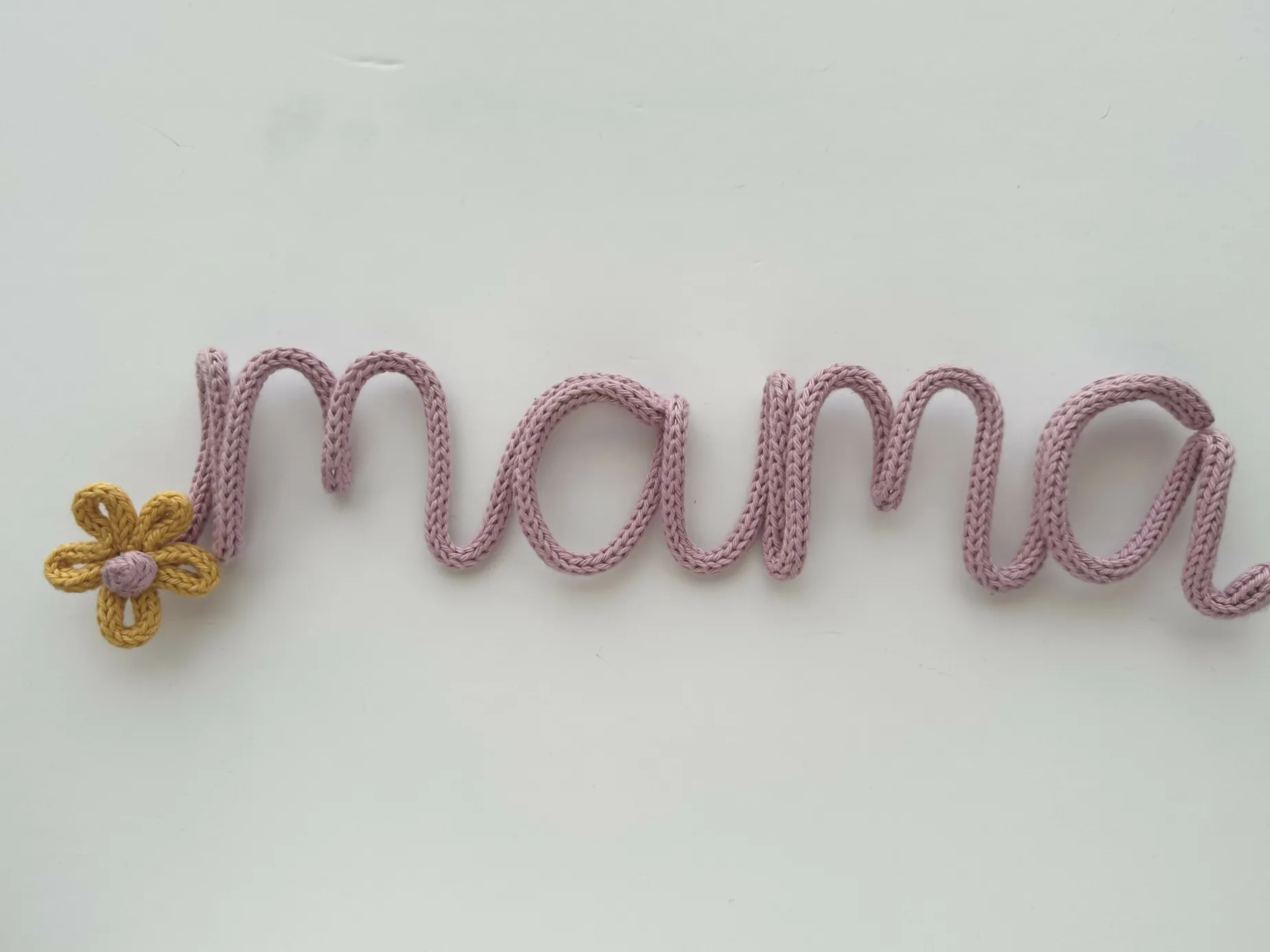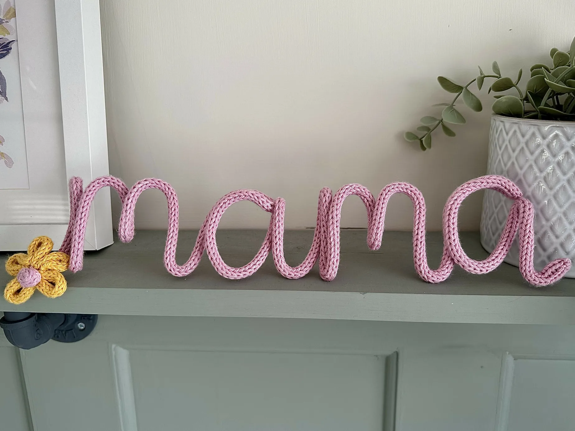 Mama knitted wire sign in a lovely pale pink and yarn jacket. Finished off with a lemon flower.