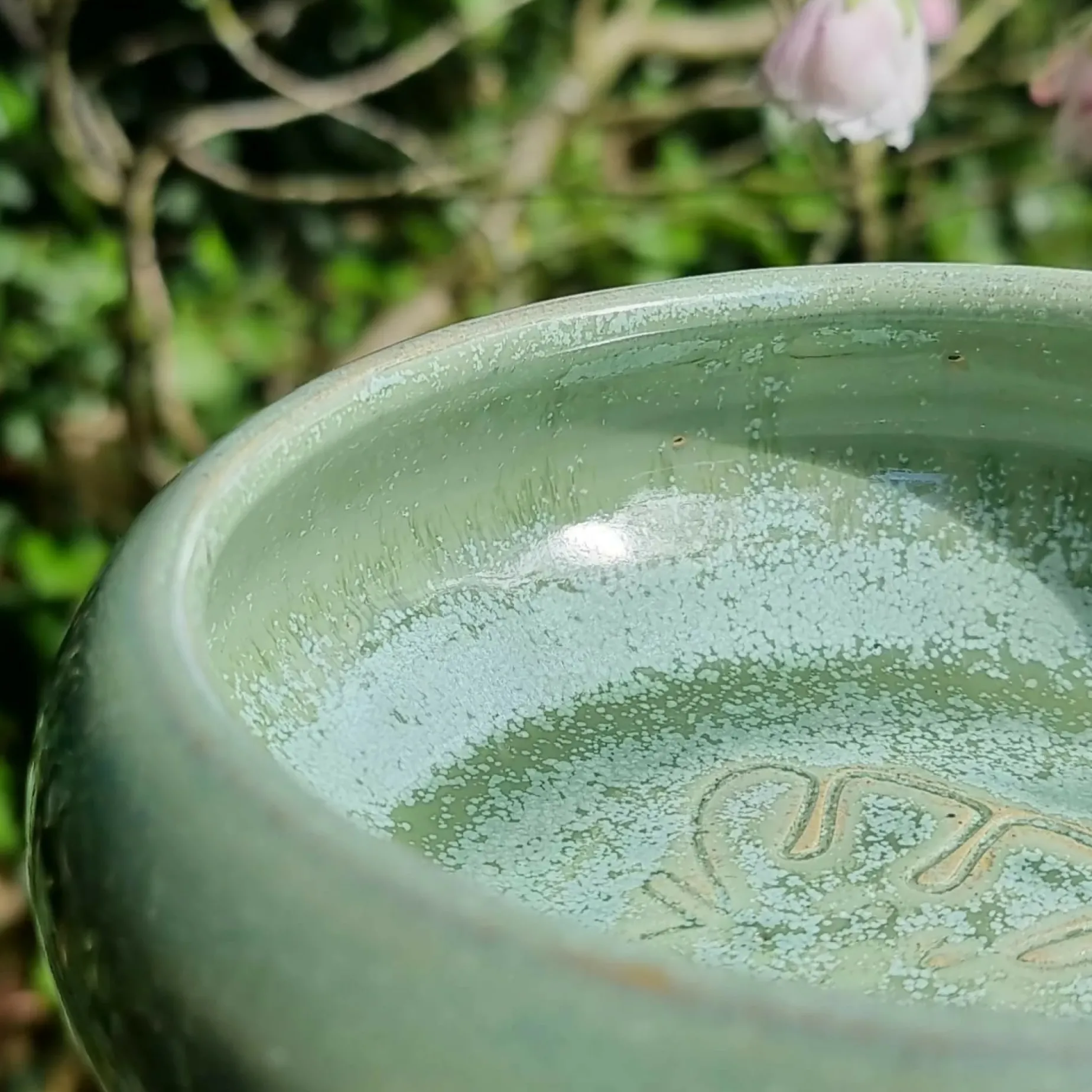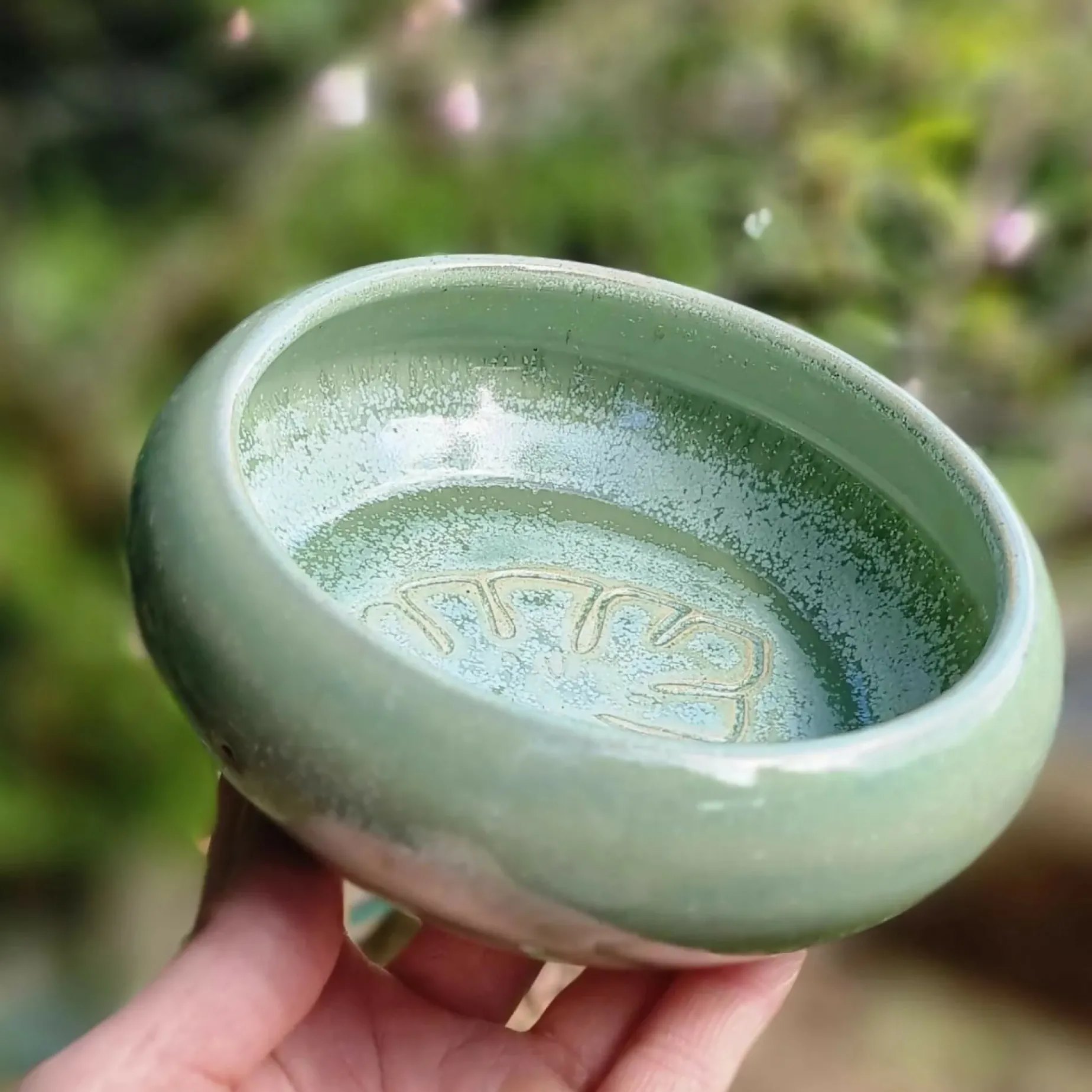 Monstera serving dish in shades of turquoise green with brown reflecses showing throug on texture. H=7cm, base diameter = 14 cm.