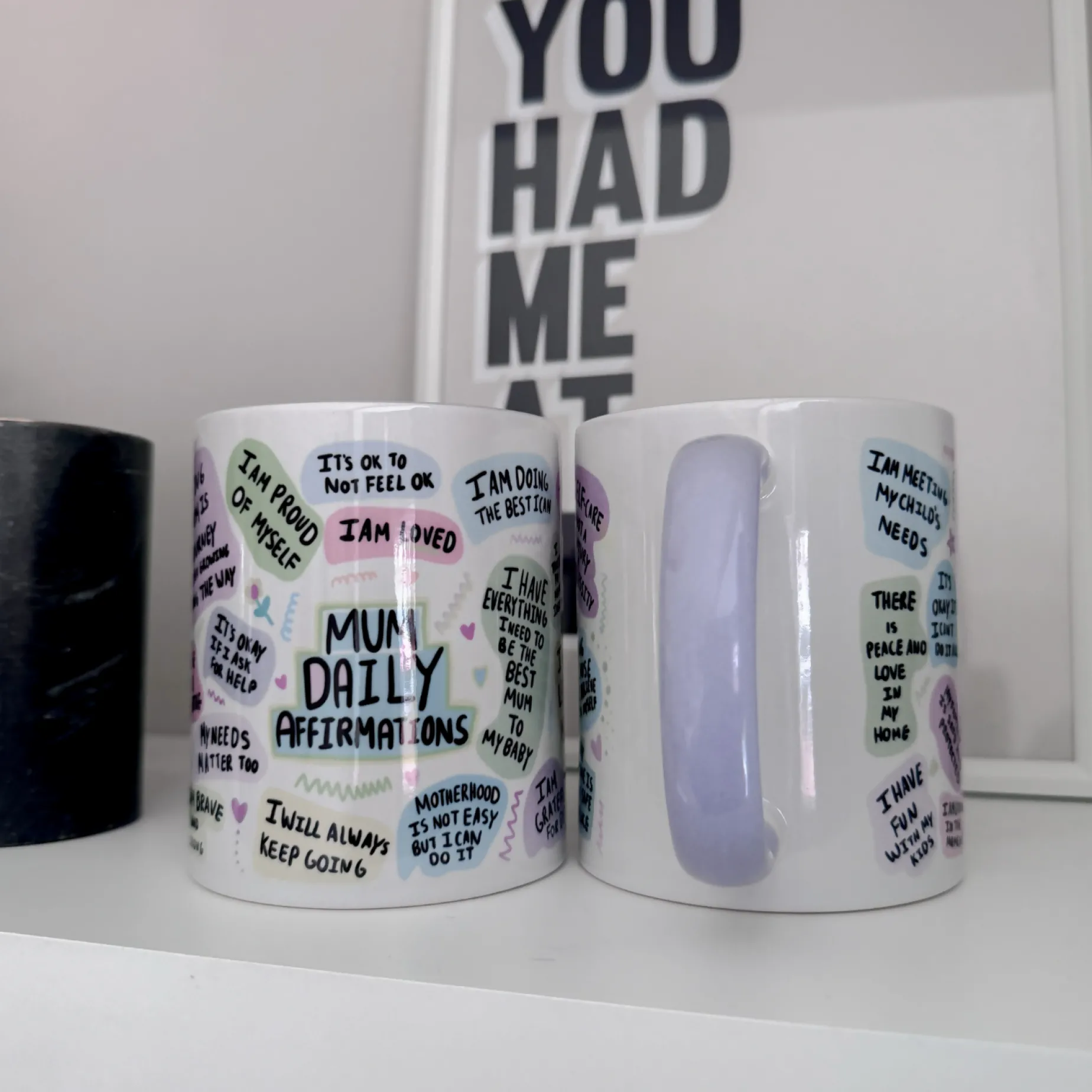 An 11oz ceramic mug featuring words of affirmation for all the mums out there. Each daily mum affirmation mug is dishwasher safe (not on a long cycle) and features a two tone inner lilac and handle making it a super cute gift idea.