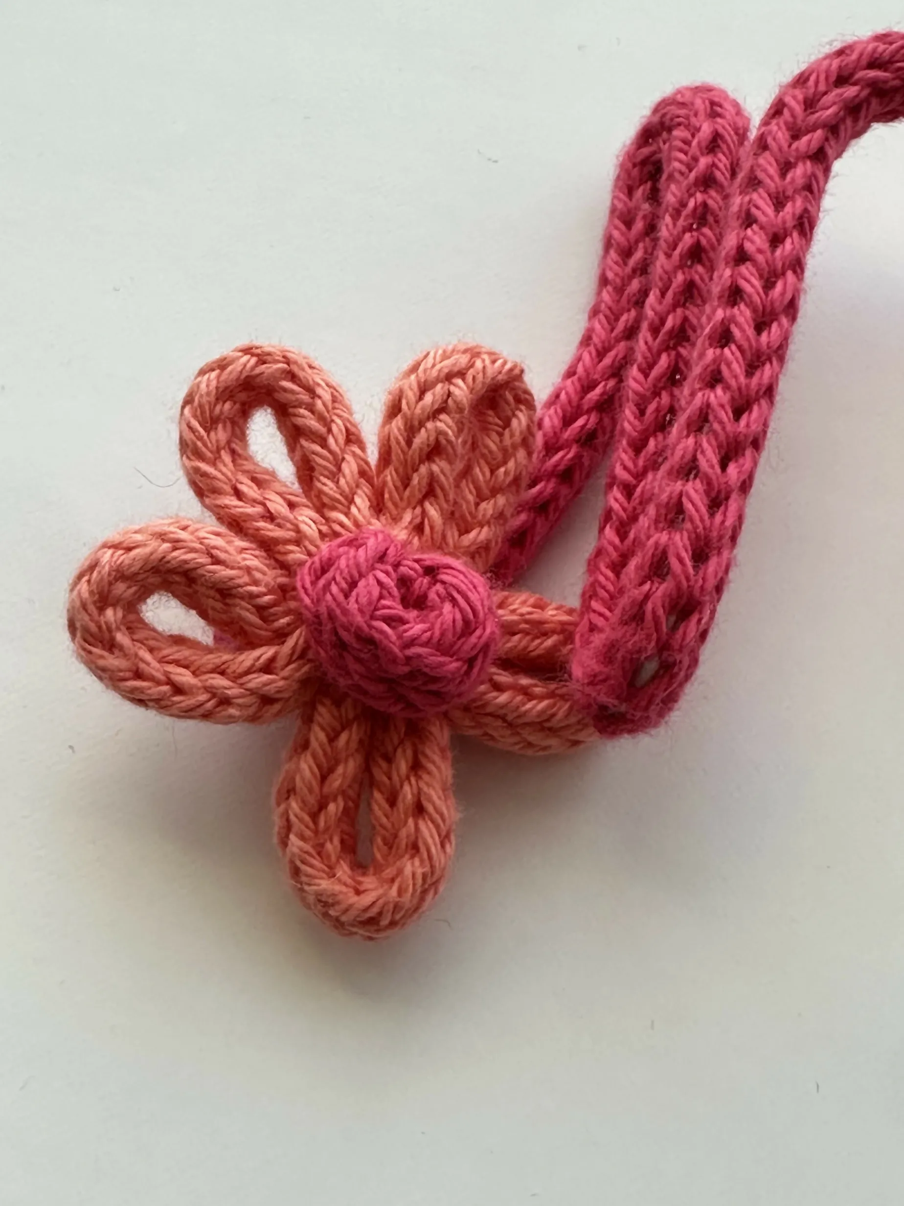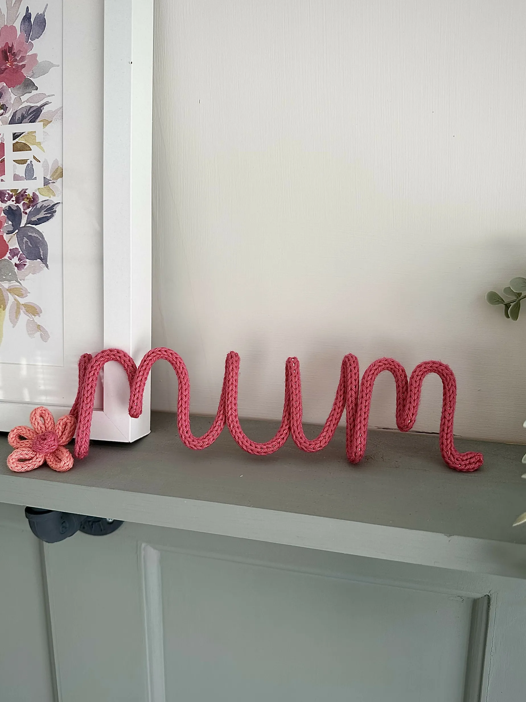 Mum knitted wire sign in a lovely pink and yarn jacket. Finished off with a peach flower.
