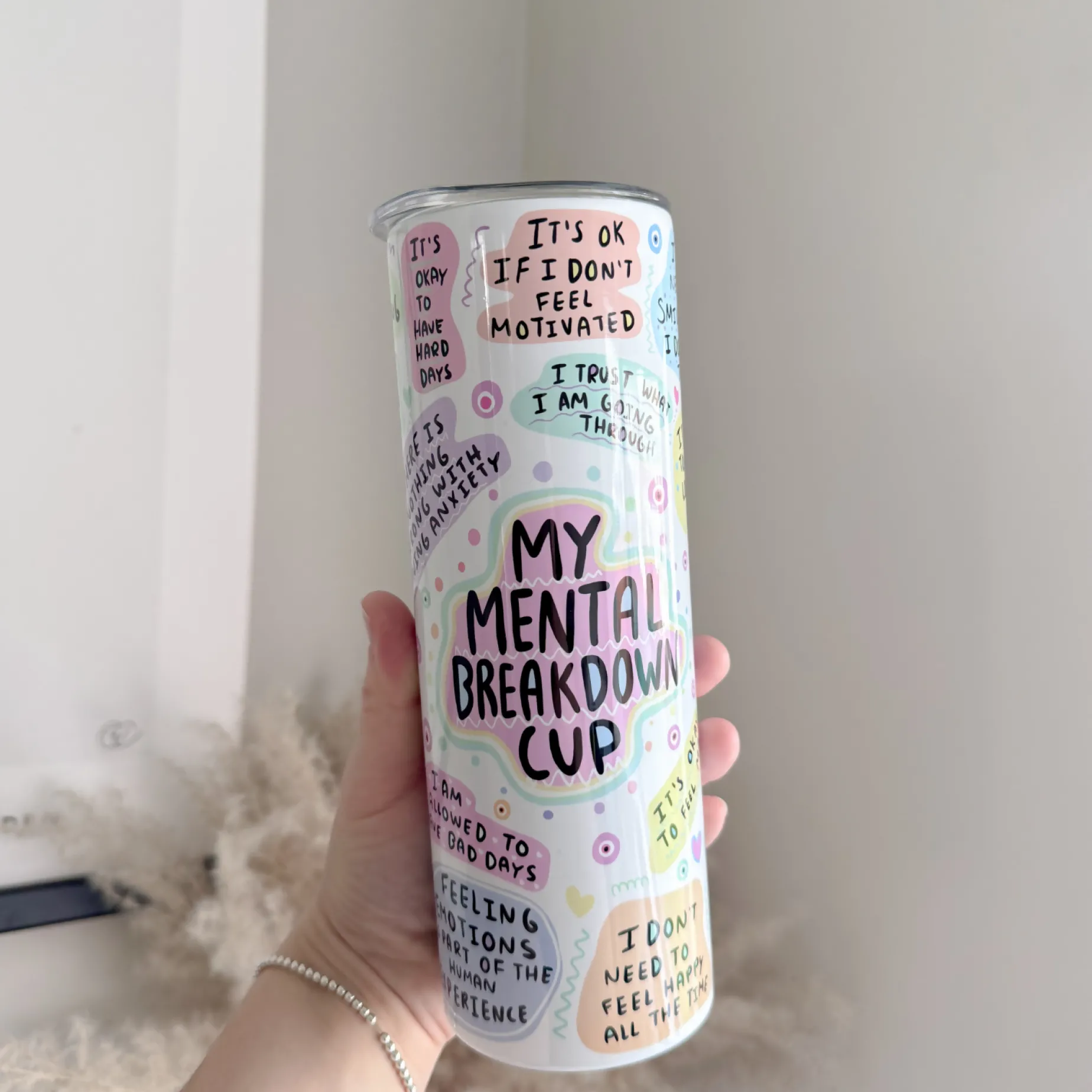 My Mental Breakdown 20oz stainless steel tumbler featuring various positive phrases. All tumblers come with a plastic straw and a BPA free lid that features a slide stopper where you can either drink straight from the tumbler or use a straw. Dishwasher friendly.