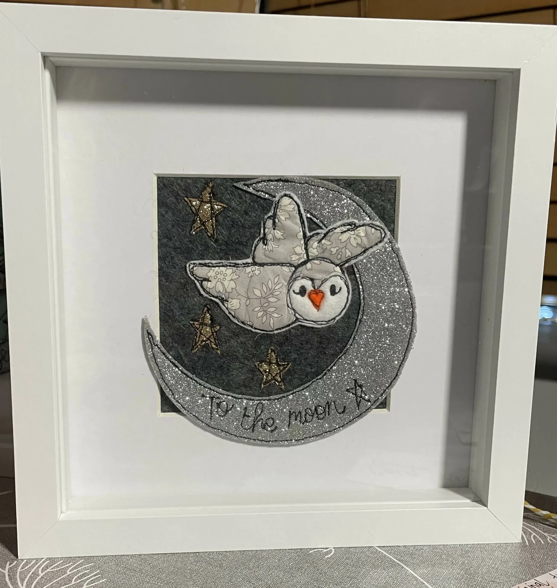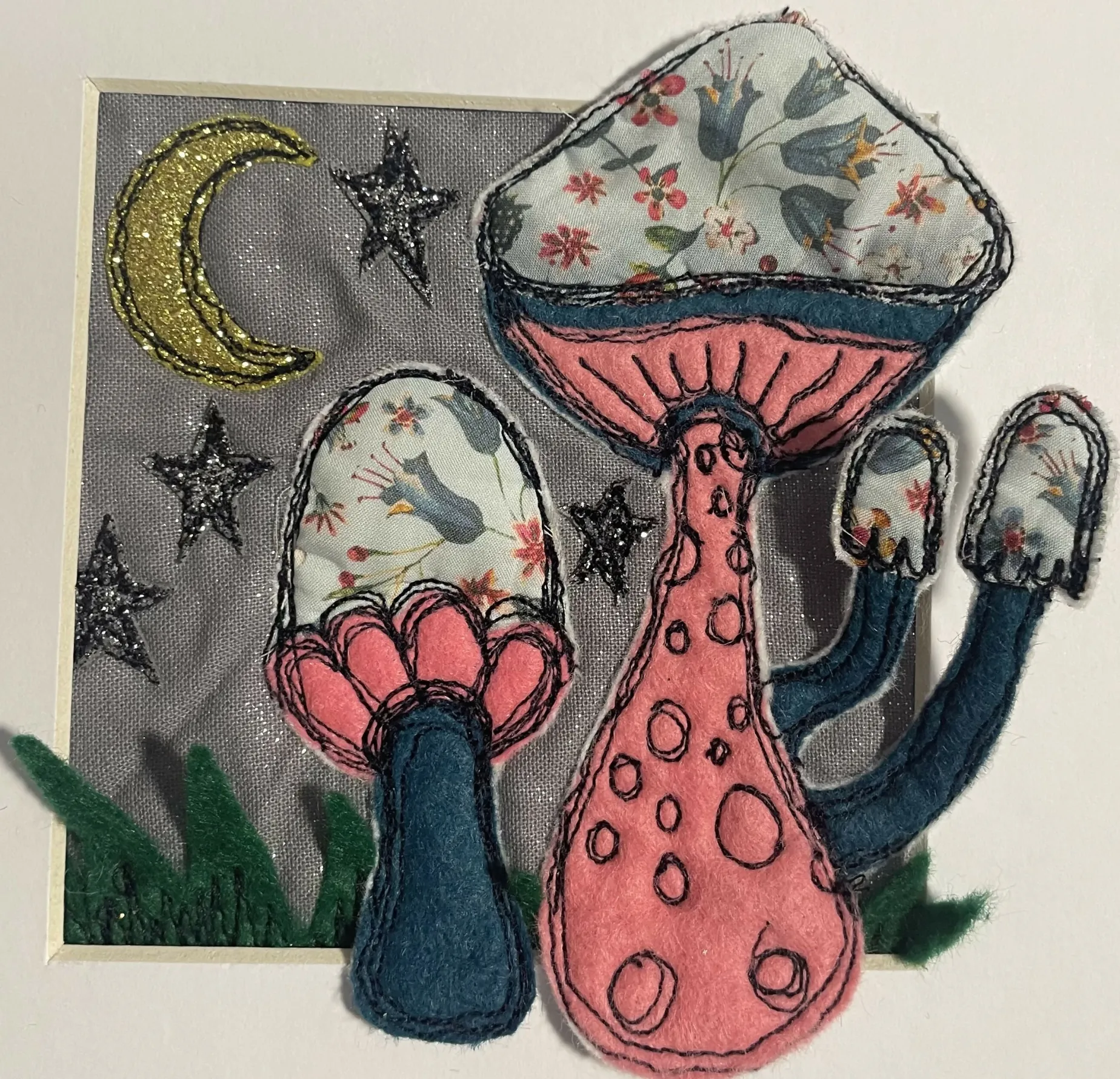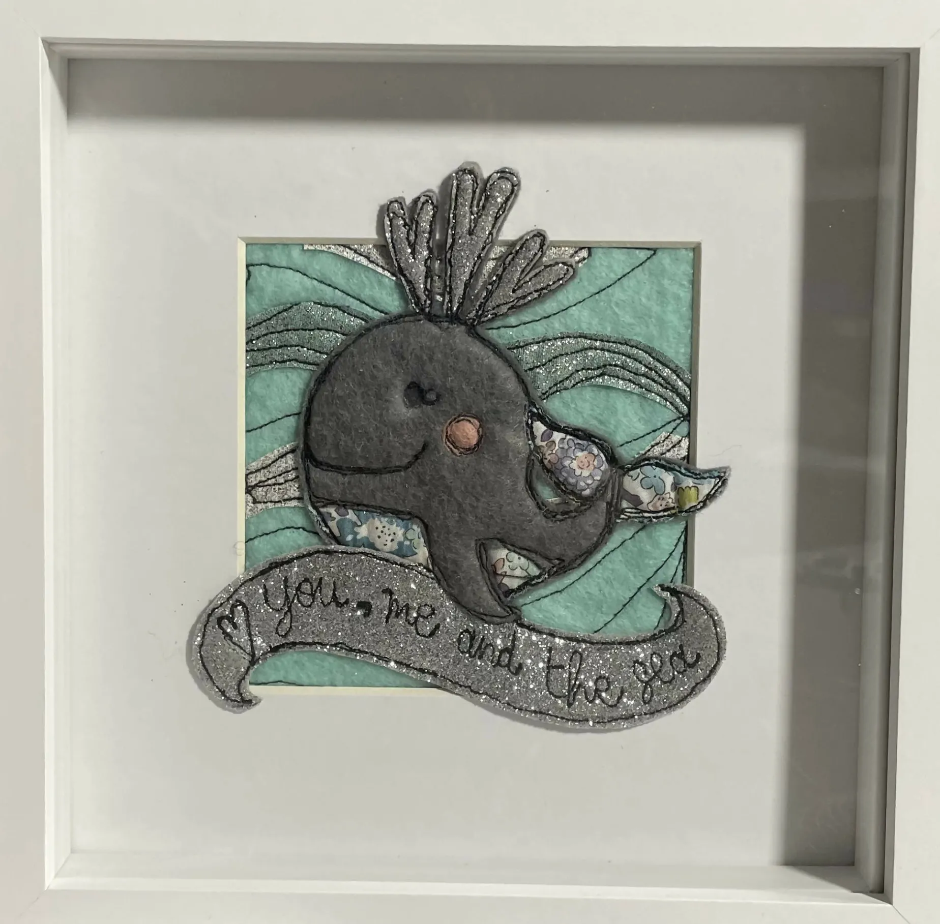 An original textile art piece. Using appliqué felt, glitter felt and Liberty of London fabric pieces- all designed, hand cut and made by me, using free motion embroidery to add character and detail. Each item is a unique ‘one off’ set within a white mount and 20 cm square box frame (widest measurement)