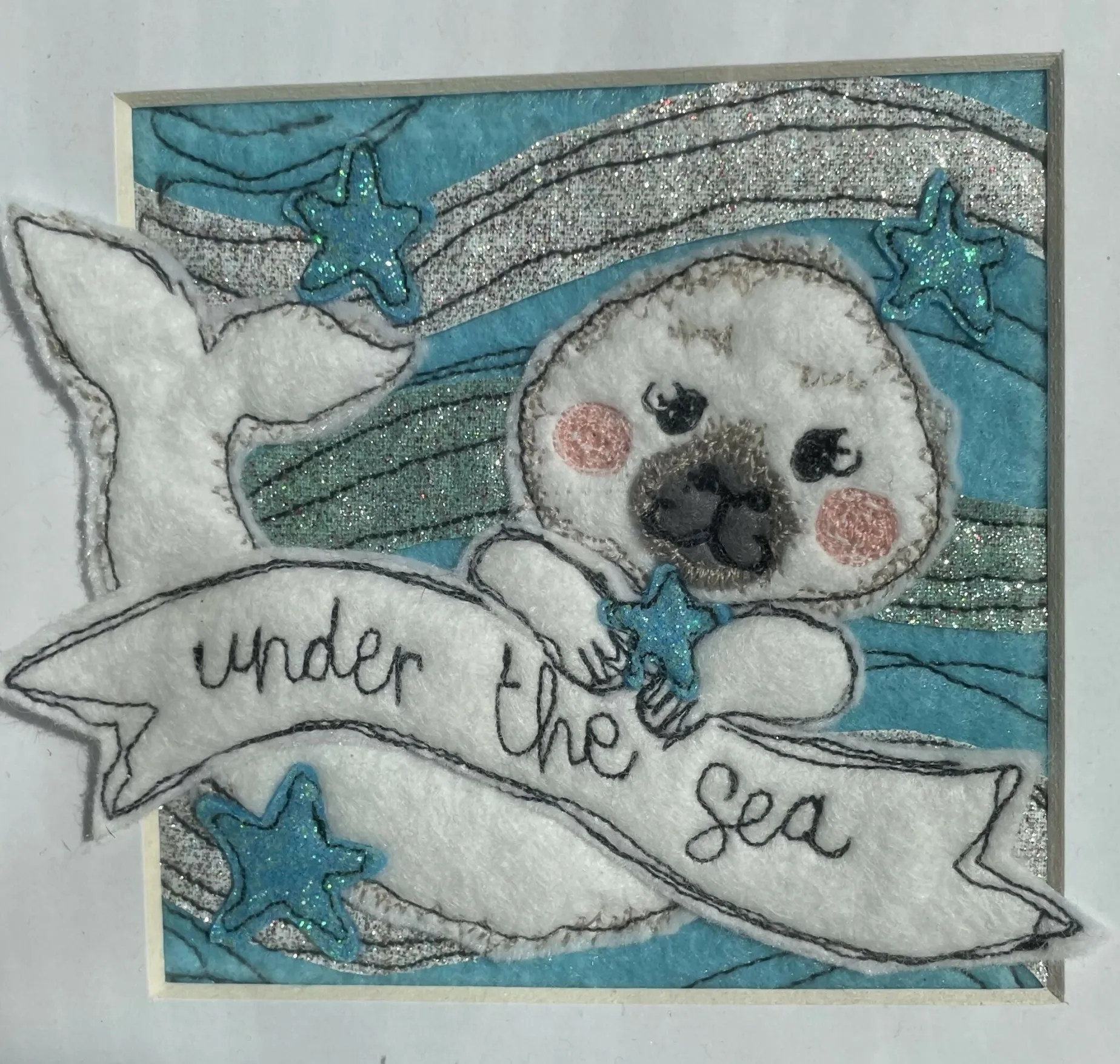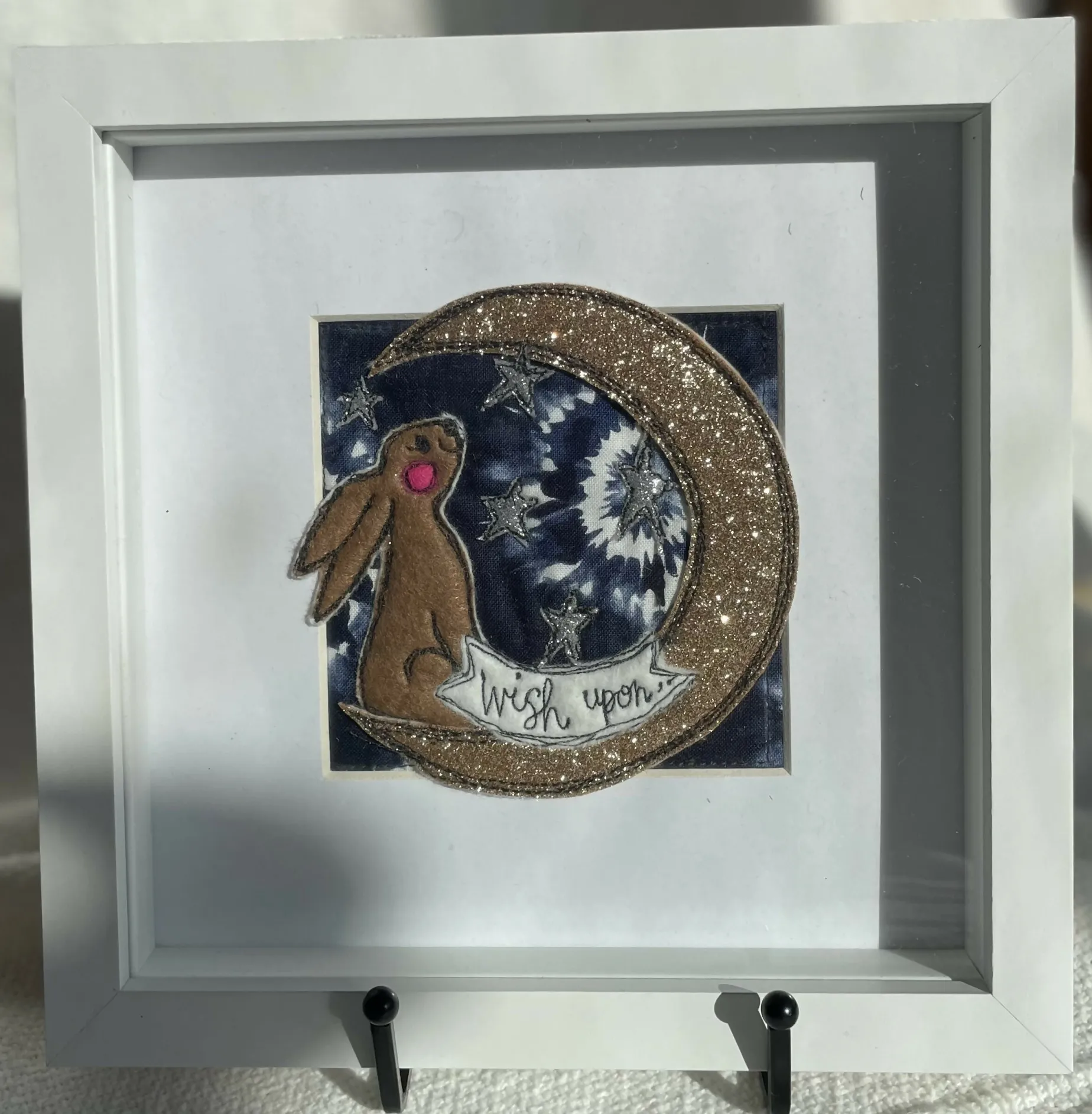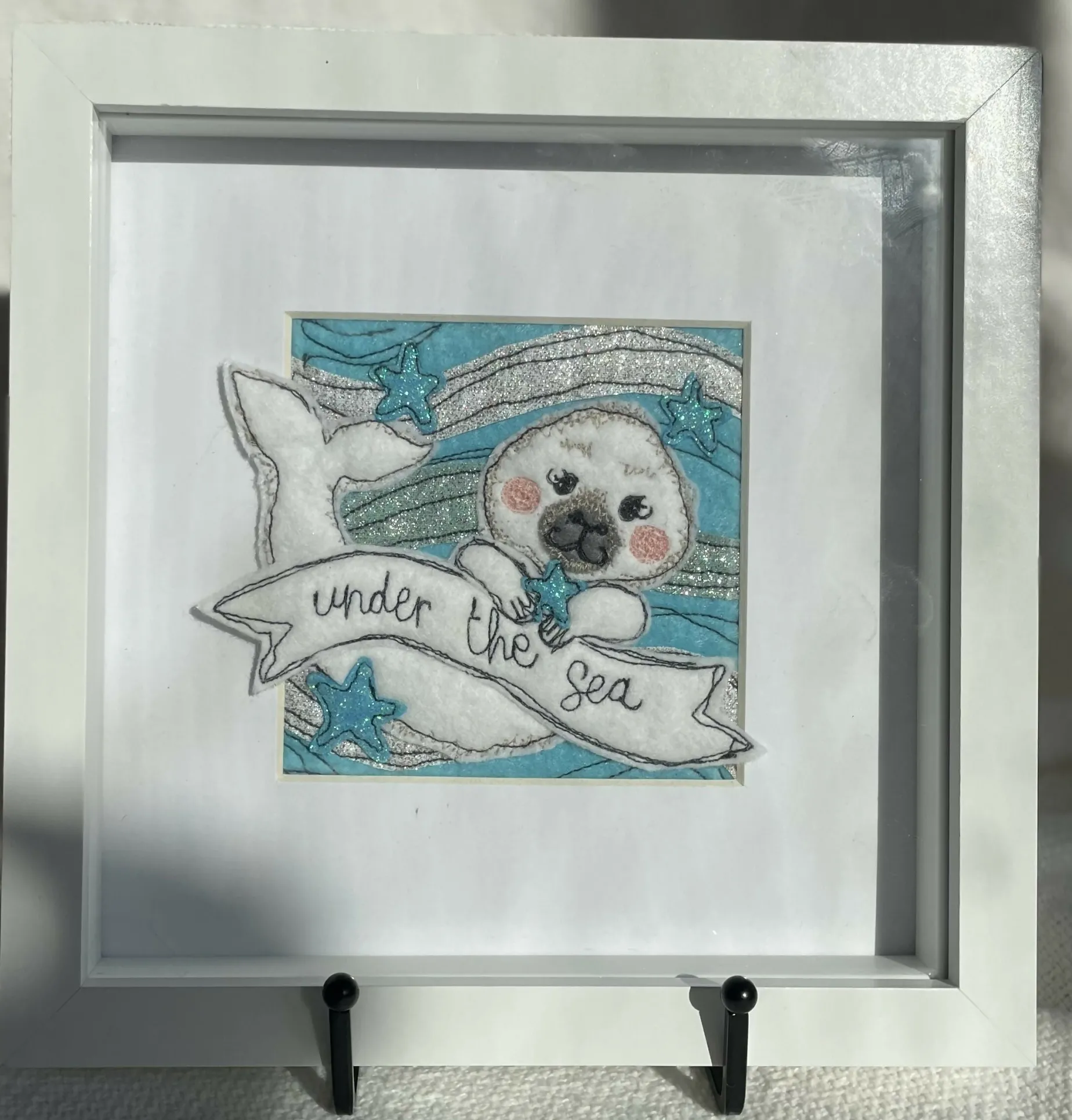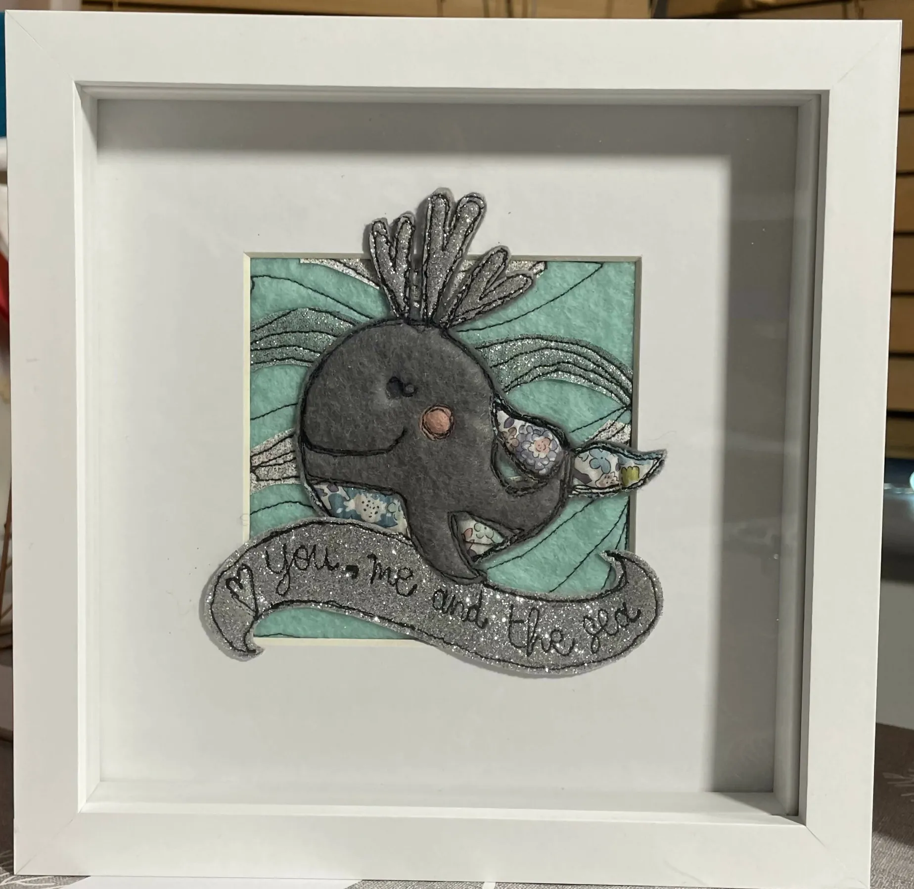 An original textile art piece. Using appliqué felt, glitter felt and Liberty of London fabric pieces- all designed, hand cut and made by me, using free motion embroidery to add character and detail. Each item is a unique ‘one off’ set within a white mount and 20 cm square box frame (widest measurement)