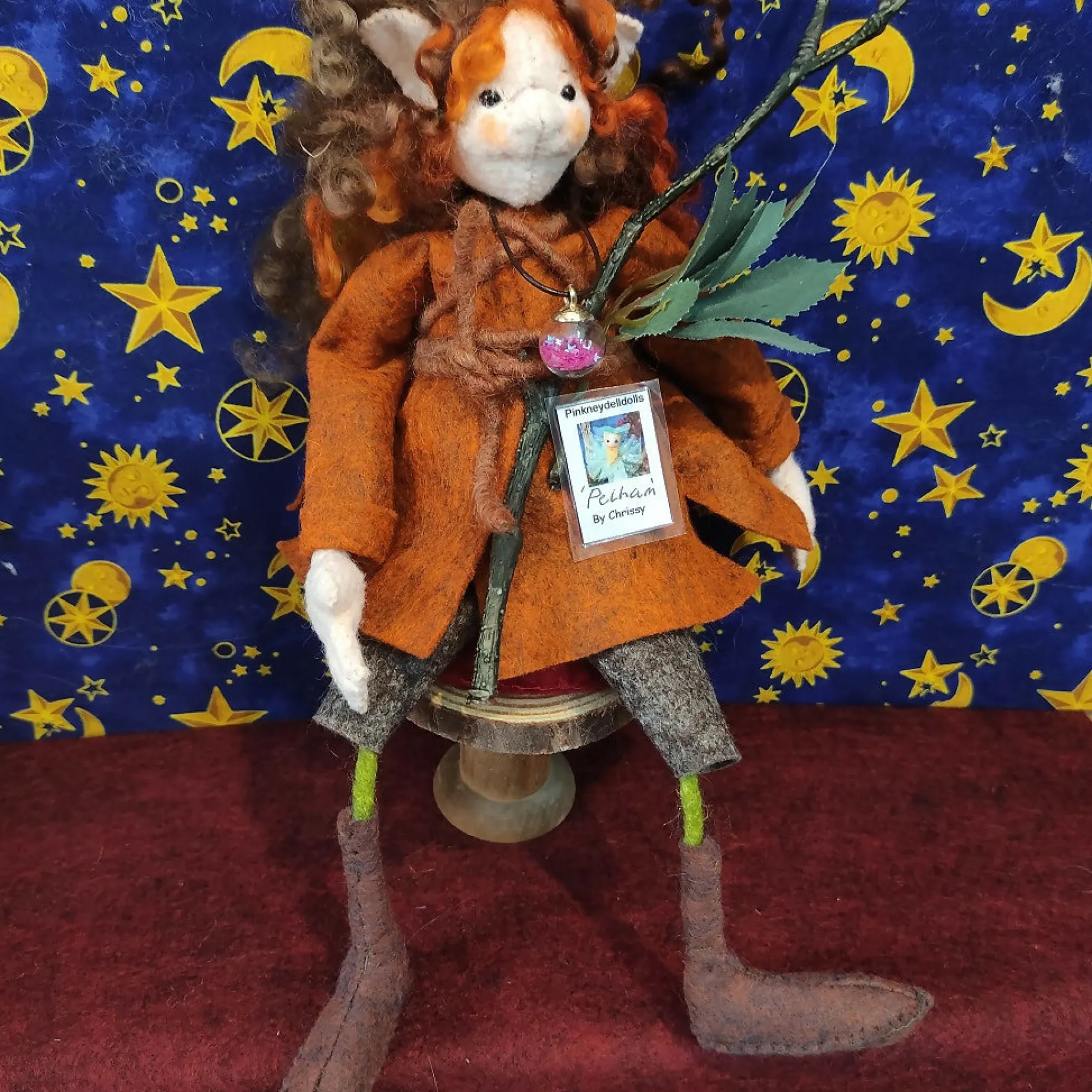 Hand crafted decorative Fantasy Creature-on-a-reel ornament by Pinkneydelldolls. Ideal gift or collector’s item. (NOT a TOY), Made from Felt, Wool, Cotton, Wood and Artificial decorations. Height is approx. 25cm.