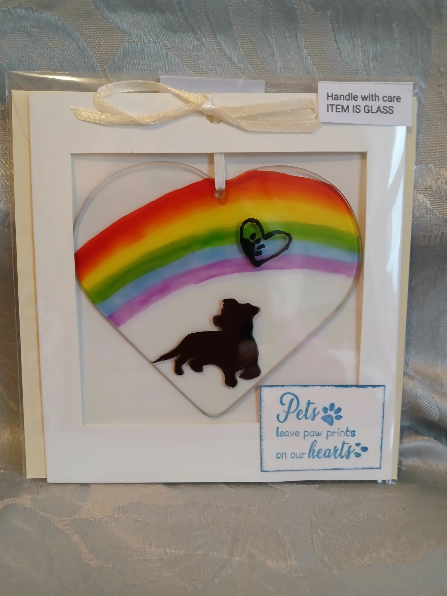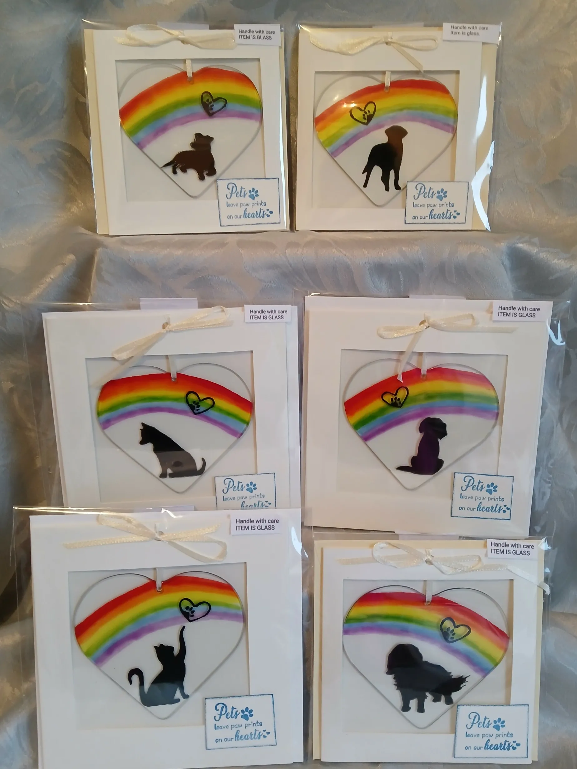 This beautiful stained glass keepsake is painted with a rainbow, heart, paw print and a silhouette of a dog. Mounted in a card with a window, can easily be removed to hang in a window or on a wall.