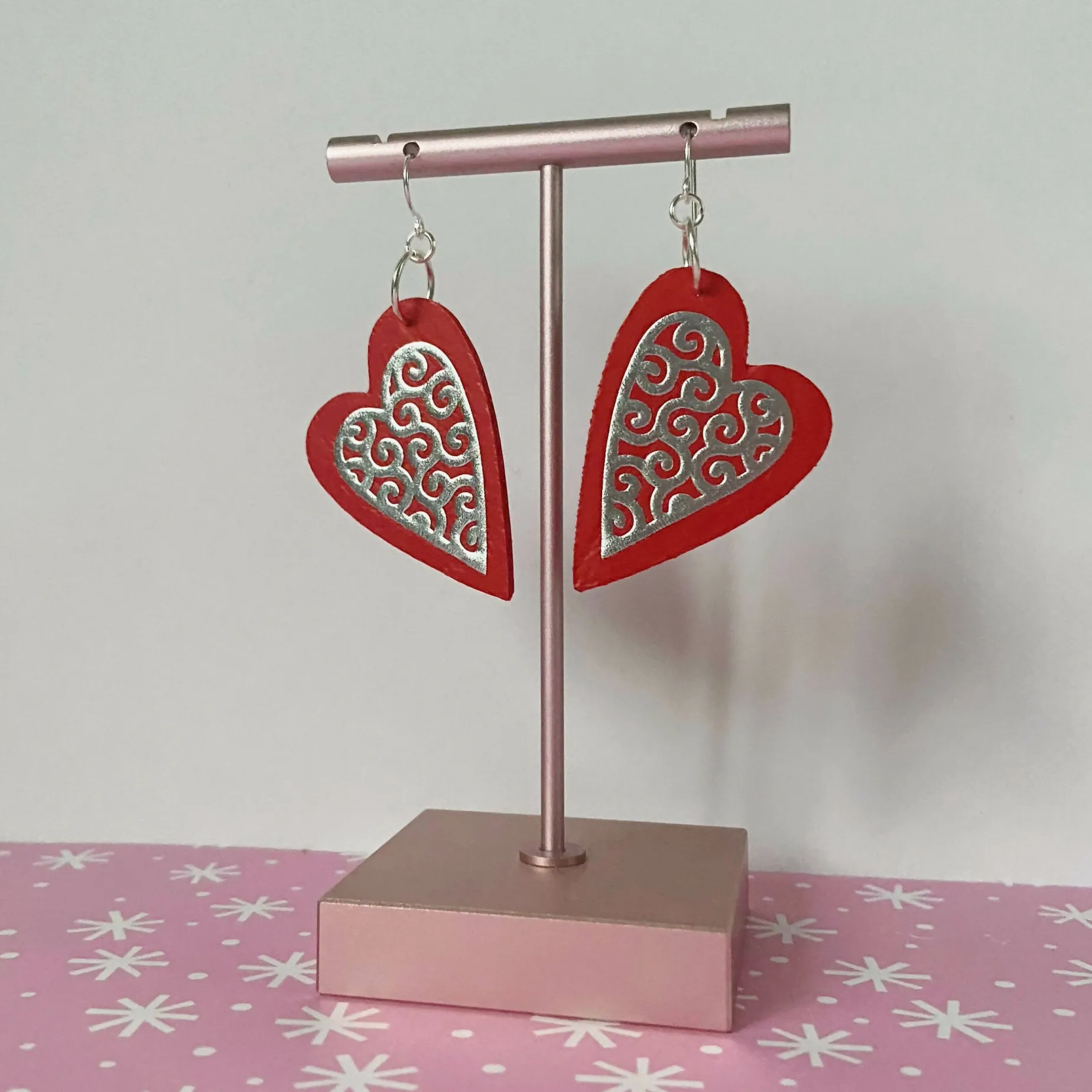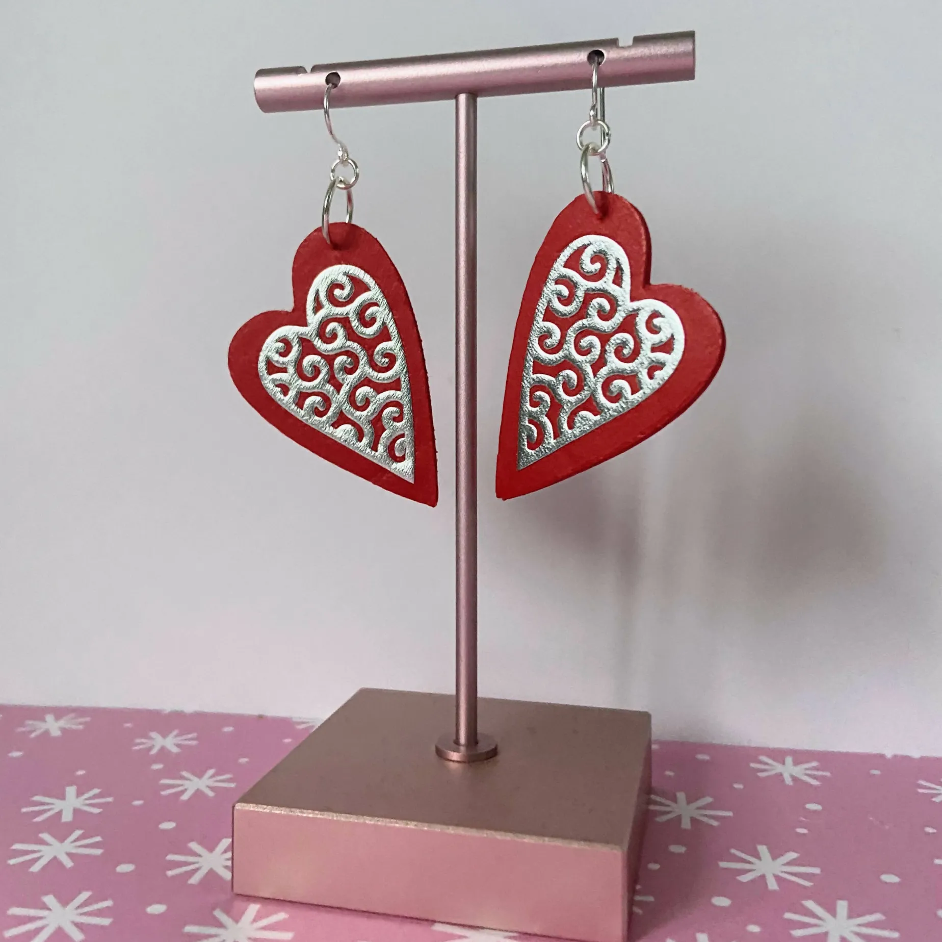 Filigree heart earrings in red faux leather on silver plated ear hooks. A red and silver design that’s the perfect gift for birthdays, Mother’s Day and parties all year around.
