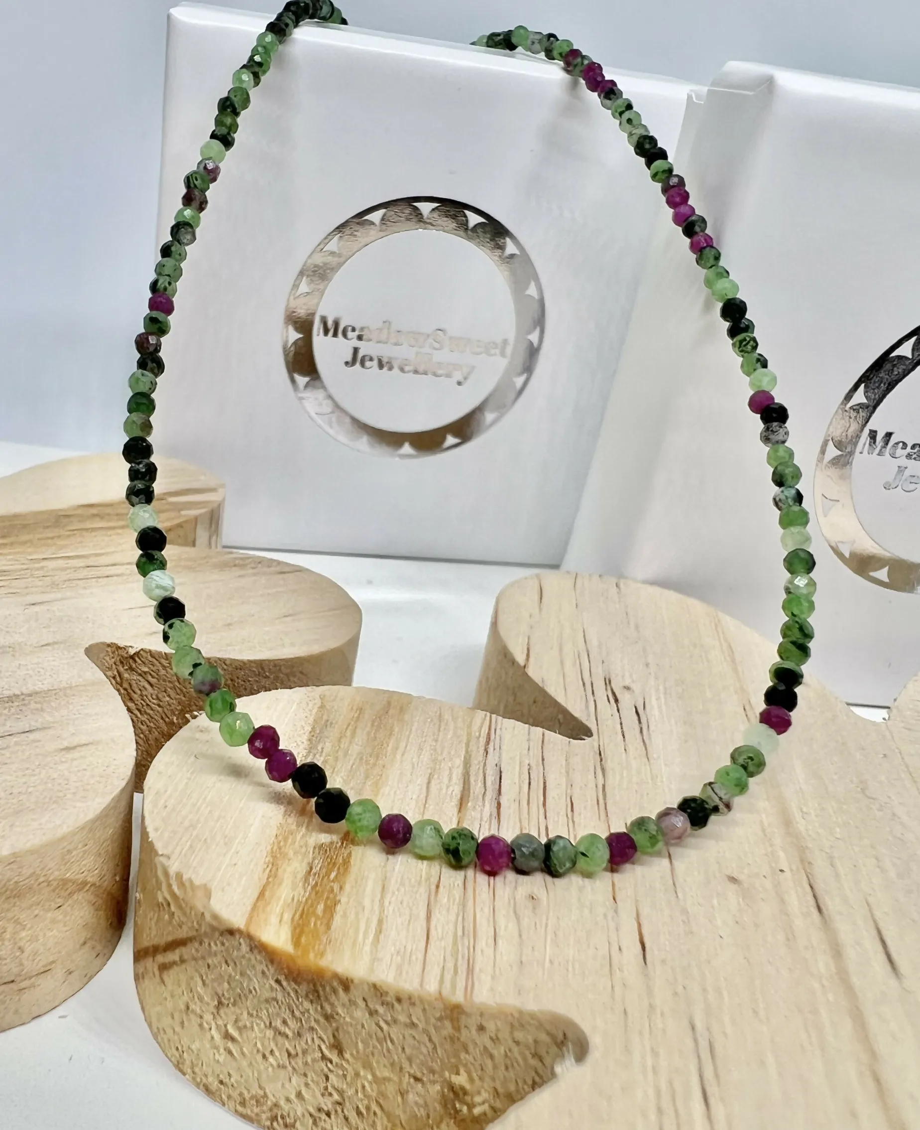 Fine Ruby zoisite beaded necklace, 18” with sterling silver lobster clasp.