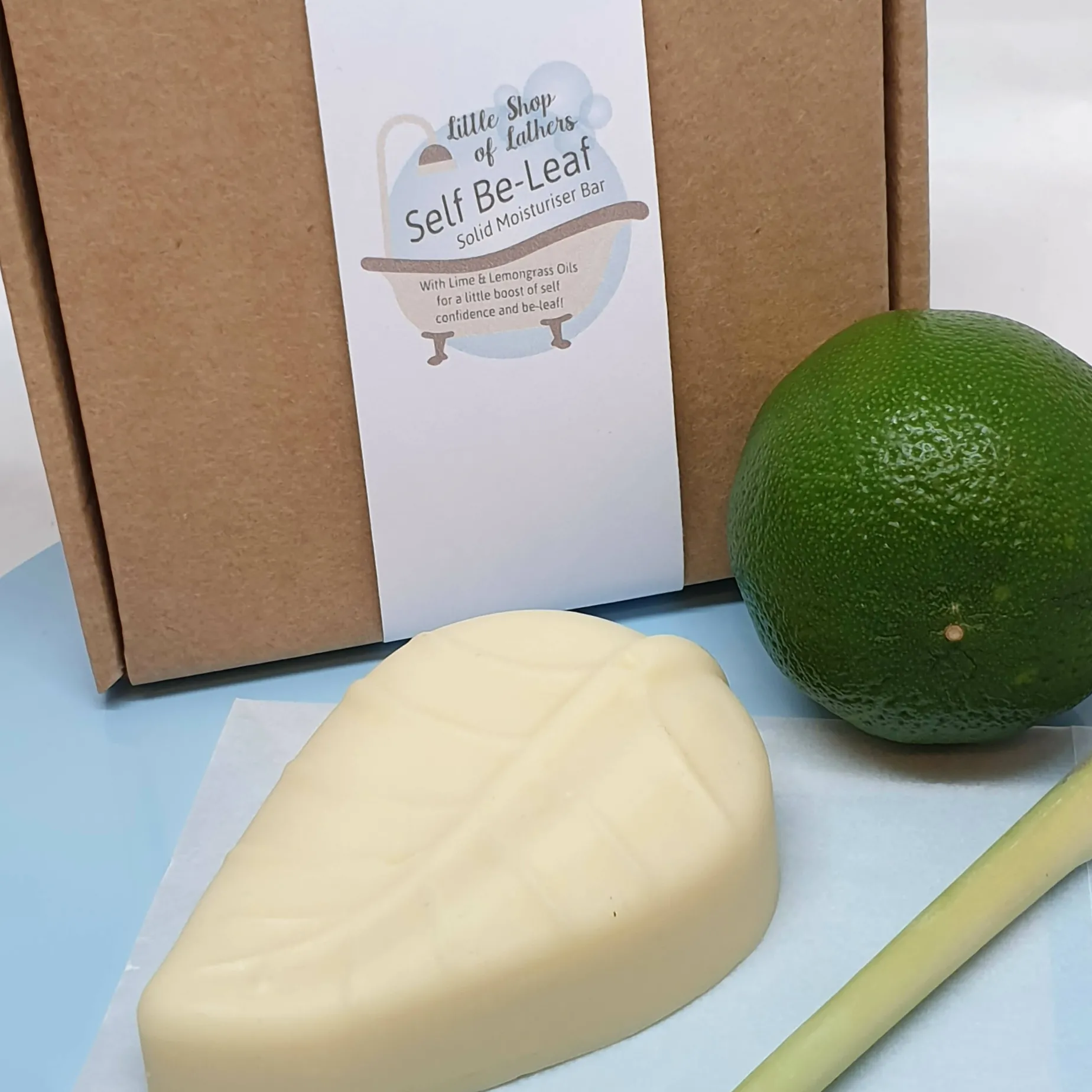 This is our Self Be-Leaf Solid Moisturiser Bar, a gorgeous, all natural Aromatherapy treatment to soften and smooth skin. Use daily as part of your beauty regime. Full of Lime and Lemongrass Essential Oils, this bar will give you a good confidence boost and a great start to the day. If you need to concentrate or have a full day of challenges it’s a great bar to use after your morning shower as the subtle citrus scents will mentally wake you up, ready for the day ahead!