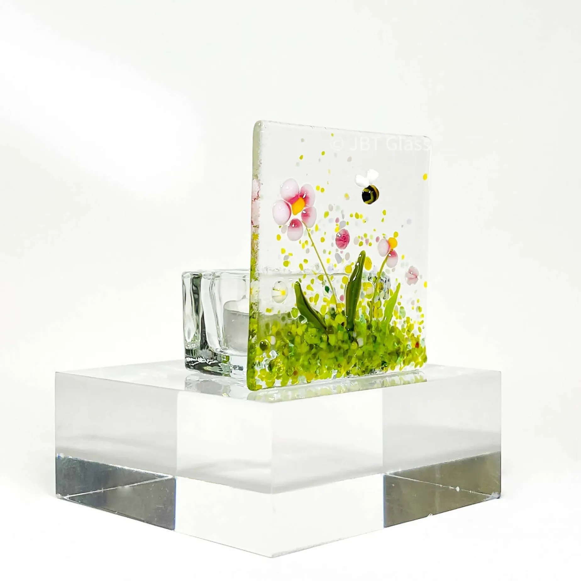 This beautiful small tealight is made totally from glass, the pink flowers are so delicate and the bee in amongst the flowers really brings the scene to life.