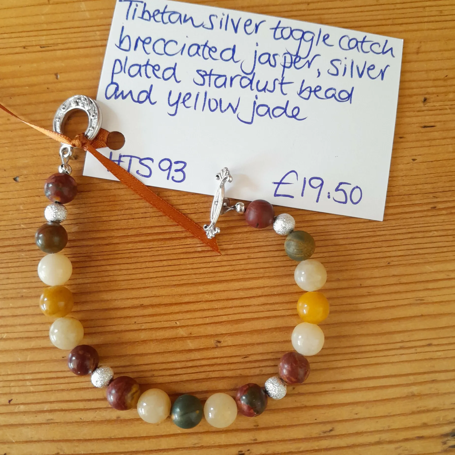 Tibetan Silver Toggle Catch Bracelet with Brecciate Jasper, Silver Plated Stardust Bead and Yellow Jade.