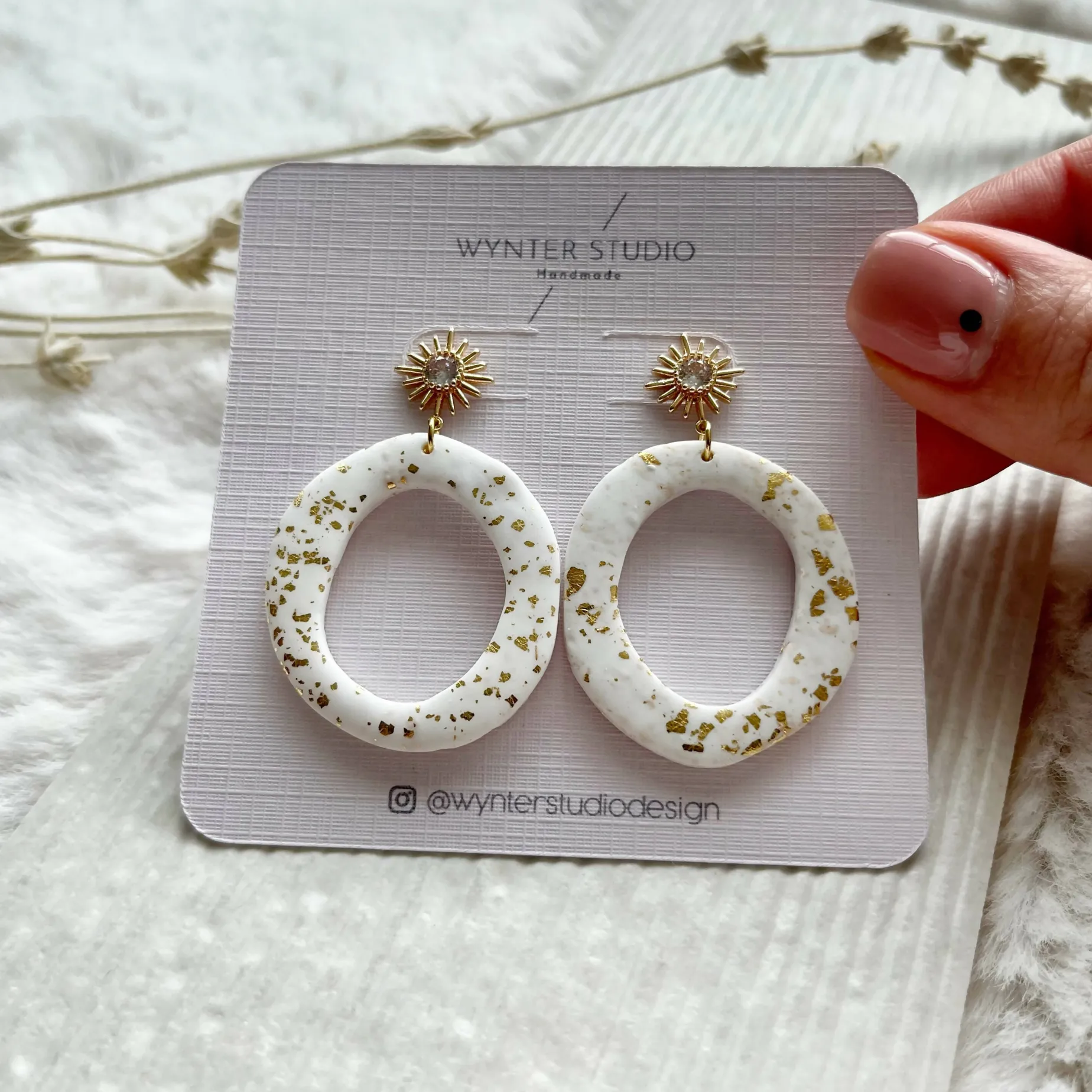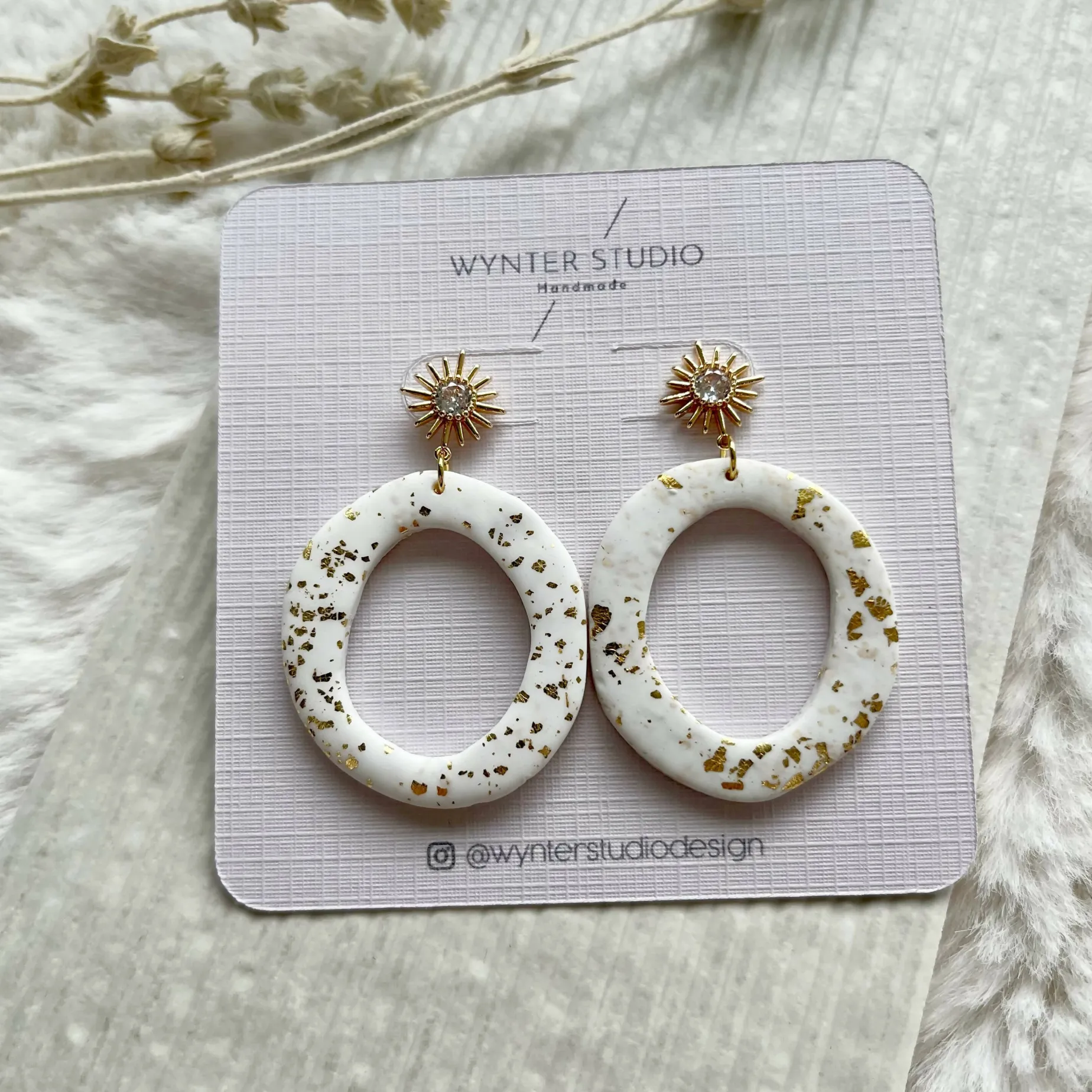 These statement abstract hoop earrings are handcrafted from hand blended white polymer clay, with an 18ct gold plated mid century star stud fastening. Measuring 6.5 cm, they would be a beautiful addition for any bridal outfit.