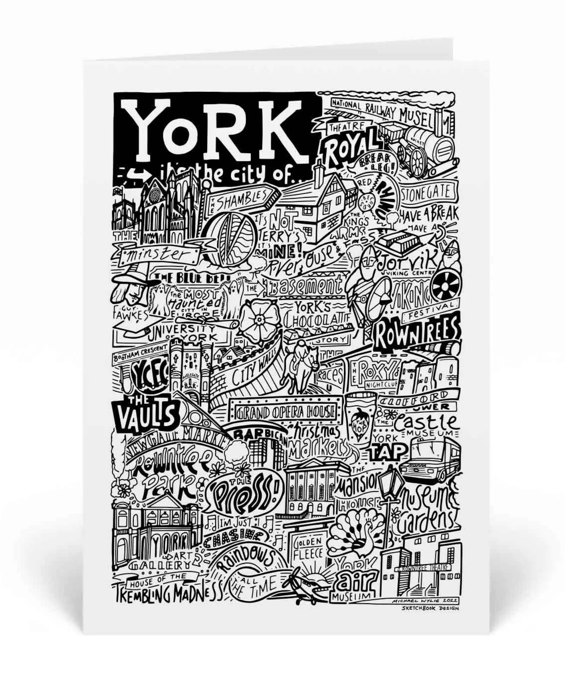 Our hand-drawn York landmarks greetings card celebrates all the great and good of the city. The design features typography and illustrations inspired by the local area and will surely spark memories with locals.
